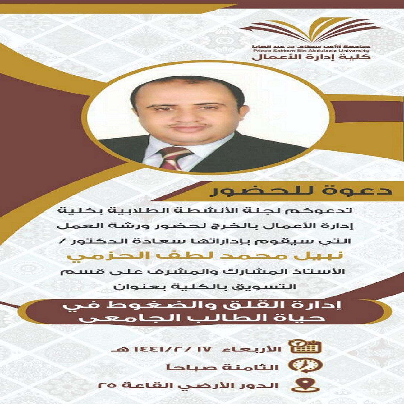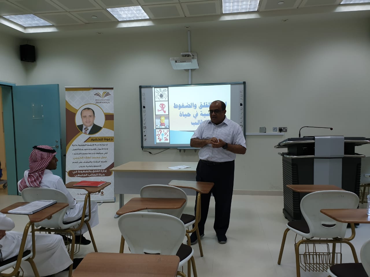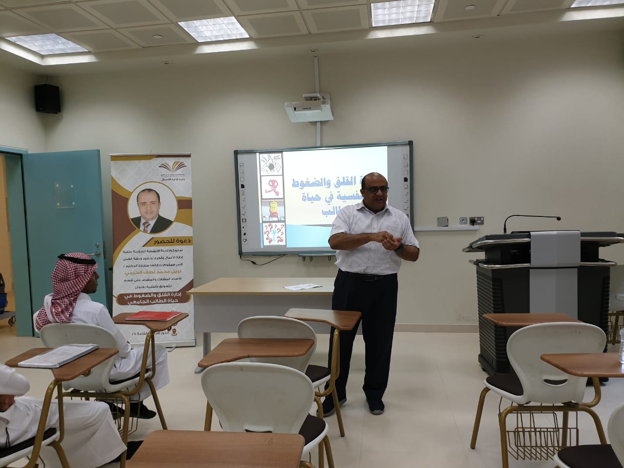 تواصلا لأنشطة لجنة الأنشطة الطلابية بكلية إدارة الاعمال بالخرج، نظمت اللجنة بتاريخ الاربعاء 1441/2/17هـ ورشة عمل بعنوان "إدارة القلق والضغوط في حياة الطالب الجامعى"، والتي تندرج ضمن خطة اللجنة للأنشطة الطلابية لهذا العام، حيث قام سعادة الدكتور/ نبيل محمد لطف الحزمى - الأستاذ المشارك بقسم التسويق ومشرف القسم بتنفيذ وإدارة الورشة، وقد هدفت الورشة إلى إكساب المشاركين المعارف لأهم الاستراتيجيات في التعامل مع الضغوطات النفسية والقلق في حياة الطالب، بالإضافة الى تزويد المشاركين بعدد من النصائح والإرشادات التى من شأنها تعزيز الثقة بالنفس لدى المشاركين للتخلص من القلق والضغوط النفسية والتي قد تؤثر على الأداء العام لهم في حياتهم الجامعية. وقد استهدفت الورشة جميع طلاب الكلية.