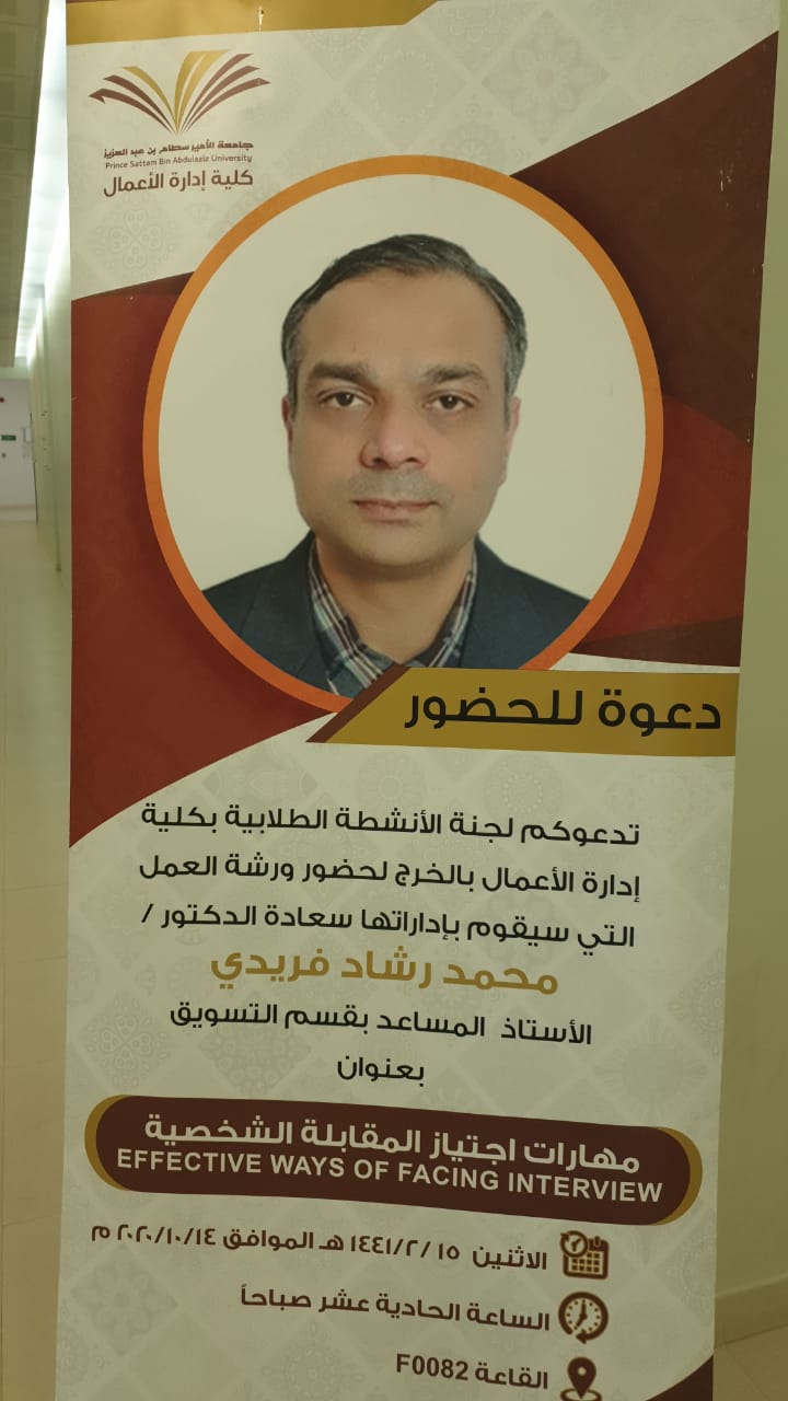 تواصلاً لأنشطة لجنة الأنشطة الطلابية بكلية إدارة الاعمال، نظمت اللجنة بتاريخ الاثنين 1441/2/16هـ ورشة عمل بعنوان المهارات الفعالة في اجتياز المقابلات الشخصية من وجهة نظر الطلاب والتي تندرج ضمن خطة اللجنة للأنشطة الطلابية لهذا العام، حيث قام سعادة الدكتور/ محمد رشاد فريدى الأستاذ المساعد بقسم التسويق بتنفيذ الورشة، وقد هدفت الورشة الى تعريف المشاركين بمفهوم المقابلات الشخصية، واهم الاستراتيجيات المتبعة في تجاوز المقابلات الشخصية بنجاح، بالإضافة الى التعريف بأهم المهارات التي يجب ان يكتسبها الطالب لتجاوز المقابلات الشخصية بنجاح. وقد استهدفت الورشة جميع طلاب الكلية خاصة المقبلين منهم على سوق العمل بشكل أساسي. هذا وقد استعرض سعادة الدكتور/ فريدى عدداً من نماذج الأسئلة التي تتكرر في المقابلات الشخصية كنموذج وكيفية الإجابة عليها، كما أثرى الورشة بمجموعة متنوعة من الإرشادات والنصائح للطلاب, وقد شهدت الورشة حضور عدد من الطلاب واختتمت بالإجابة على أسئلتهم..