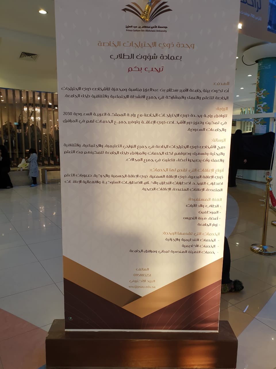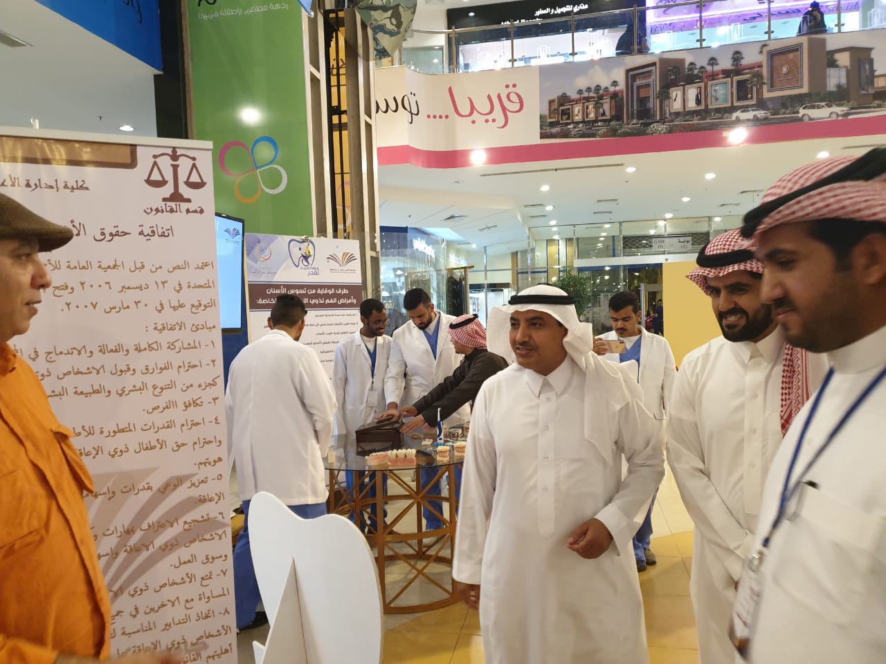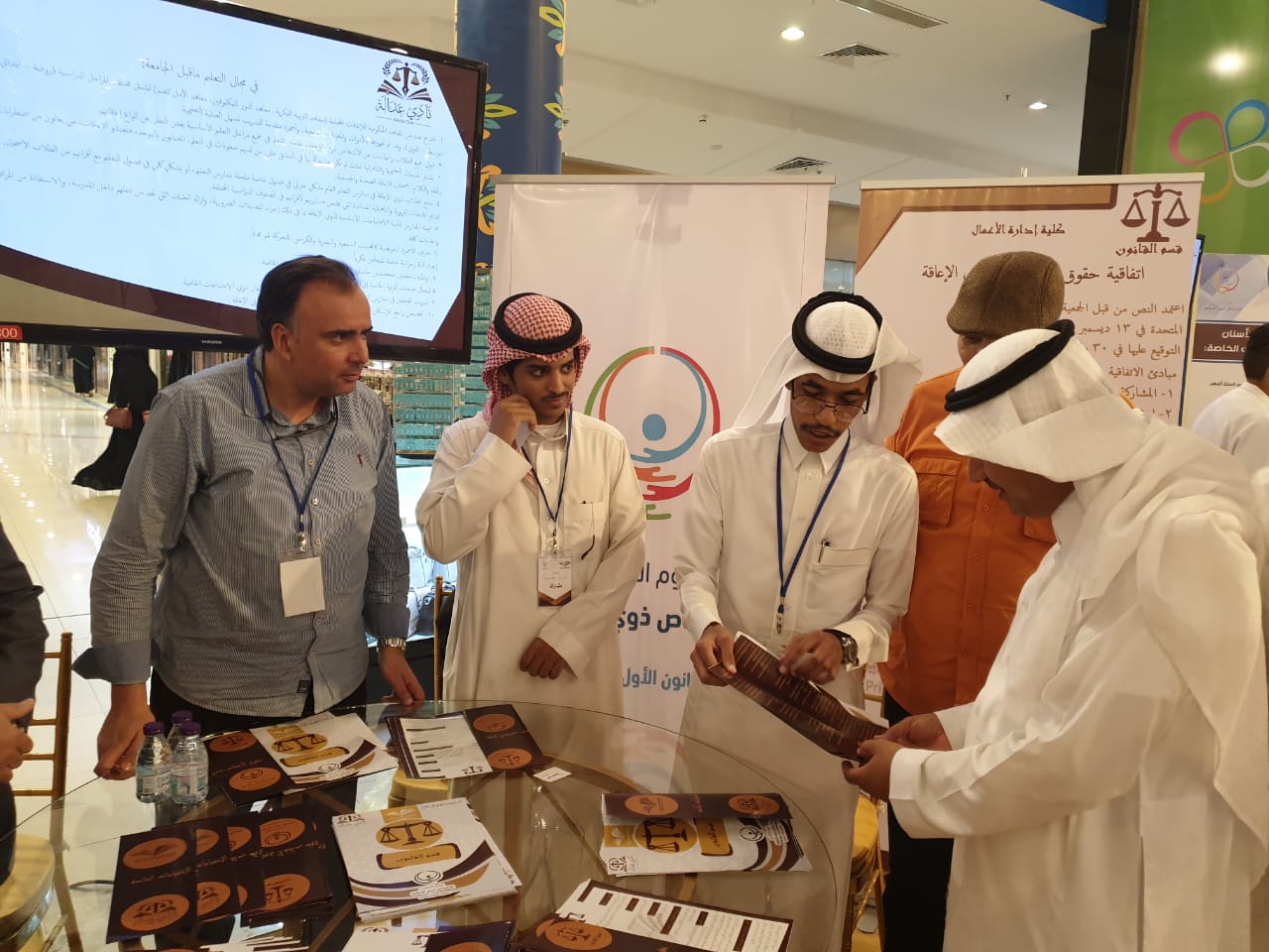 وقد ترأس حفل الافتتاح سعادة عميد شؤون الطلاب الدكتور ثلاب بن عبدالله الشكرة والذي قام بجولة في مختلف الأجنحة بمقر الفعالية ومنها جناح قسم القانون الذي قدم فيه منتسبو القسم من طلاب وأعضاء هيئة التدريس لمحة مختصرة عن دور القسم في التوعية القانونية والحقوقية لفئات المجتمع ومنها فئة ذوي الاحتياجات الخاصة. وقد هدفت هذه الفعالية إلى اندماج هذه الفئة بالمجتمع في ضوء الأنظمة القانونية والتشريعات الدولية ذات الصلة وتوعيتها بحقوقها.