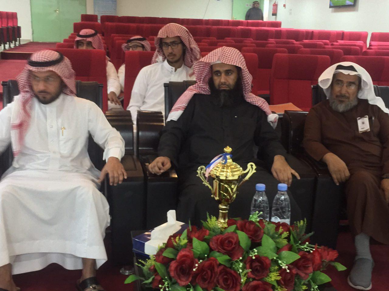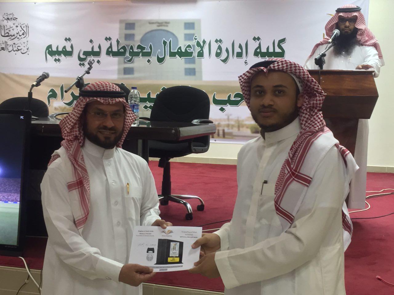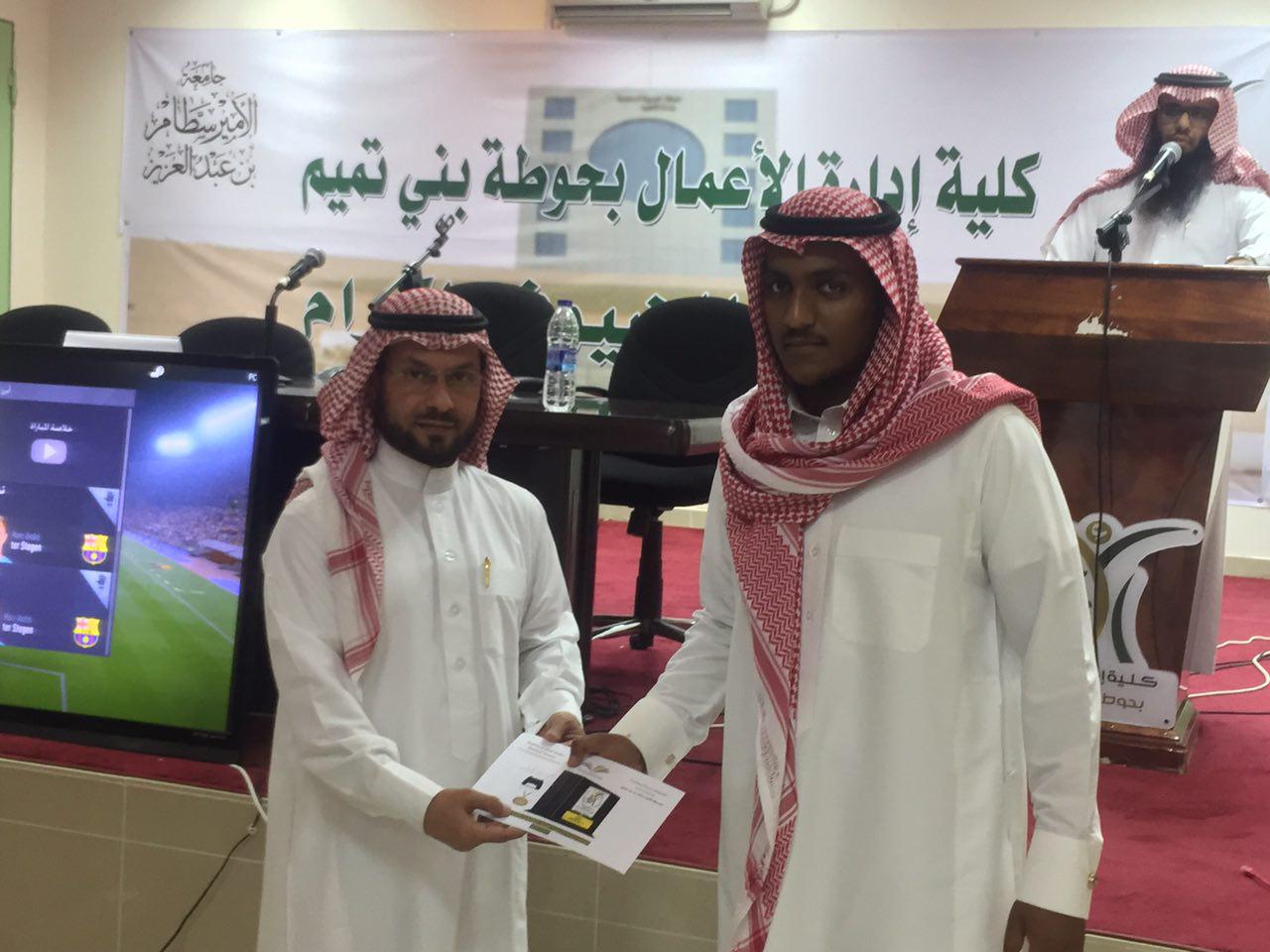 كما كرَّم عميد الكلية د. خالد العتيبي الطالب أسامة بن زيد الخنفور الذي مَثَّل الكلية في عدد من البرامج والمسابقات التي نظمتها عمادة شؤون الطلاب، وقد حاز المركز الثالث في مسابقة (مواهب ٢) بمحور الإنشاد الفردي على مستوى الجامعة.