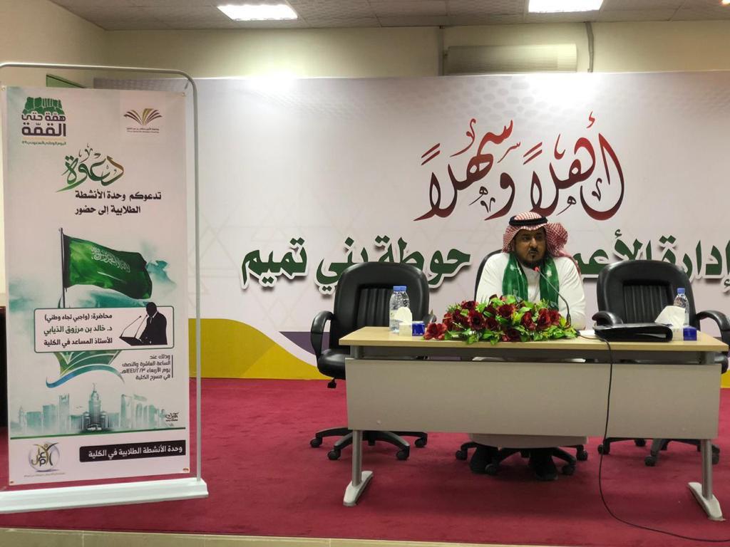 افتُتح البرنامج بآيات من القرآن الكريم رتّلها الطالب محمد بن عبدالرحمن العرفج، بعد ذلك قدّم د. خالد بن مرزوق الذيابي الأستاذ المساعد في الكلية محاضرة تحت عنوان: (واجبي تجاه وطني)، تحدث فيها عن مفهوم الوطن، مشيرًا إلى تاريخ الدولة السعودية الأولى والثانية، ومبيّنًا أساس الحكم التي قامت عليه، كما حثّ على السمع والطاعة لولاة الأمر في غير معصية الله - تعالى -، ودعا إلى المحافظة على نعمة الأمن والاستقرار والرخاء بالالتزام بشرع الله - عز وجل -، ونبذ البدع والمنكرات المقوّضة للنعم.