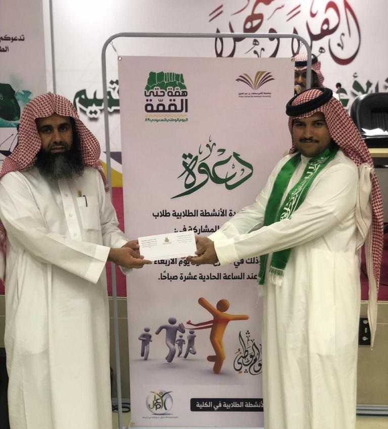 نظمت كلية إدارة الأعمال في حوطة بني تميم برنامج الاحتفاء باليوم الوطني، بحضور عميد الكلية د. إبراهيم بن محمد الداود، وعدد من أعضاء هيئة التدريس والموظفين والطلاب، وذلك في يوم الأربعاء ١٤٤١/٢/٣هـ.