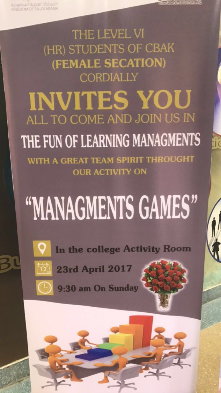 اقامت كلية ادارة الاعمال "قسم الطالبات" نشاط بالمستوى السادس بعنوان "لعبة الادارة" بكلاس اساسيات الادارة. حيث تم تقسيم الطالبات إلى اربعة فرق و كل فريق احتوى على اربع طالبات. ويعطي النشاط هذا أهمية لمهارات الإدارة الفعالة و التحفيز على العمل بروح الفريق من خلال التعلم على كيفية التخطيط والتنظيم والقيادة بين أعضاء الفريق الواحد حيث اعتمد النشاط بشكل اساسي على الملاحظة و الادارة لما في ذلك من رفع تنمية المهارات و التطوير و التواصل فيما بينهم بالحرص على كيفية ادارة الوقت. و كان النشاط ملئ بالحيوية و البهجة و الحماس و بحضور الطالبات و بعض من أعضاء هيئة التدريس و في ختام النشاط تم تكريم الفائزين بهدايا تذكارية بسيطة و محفزة.