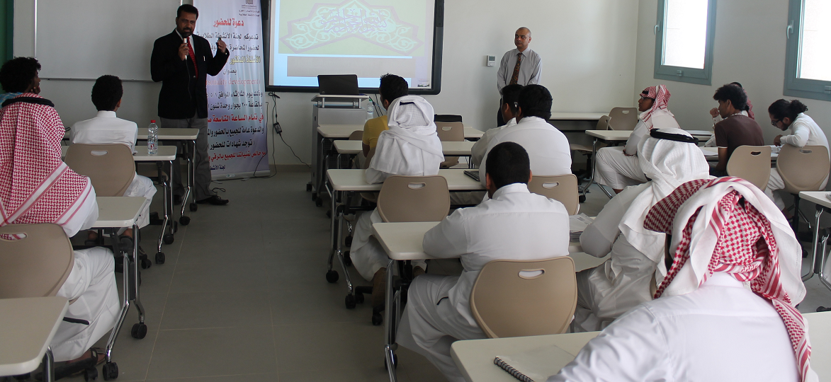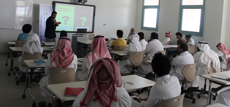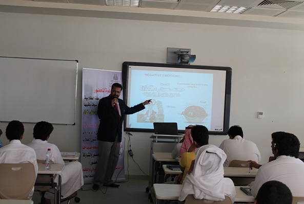 محمد هلال - كلية إدارة الأعمال بالخرج : أقامت لجنة الانشطة الطلابية بكلية إدارة الأعمال بالخرج ورشة عمل بعنوان "تطويرالذات" قدمها الأستاذ الدكتور نواب علي خان بهدف تعريف الطلاب بمفهوم تطوير الذات والفرق بين الثقة بالنفس والغرور مع بيان أهمية نظرة الشخص لذاته وأساليب برمجة العقل الباطن بالأفكار الايجابية والحرص على معالجة الافكار السلبية، مبيناً اثرها على الانسان كمعوق داخلي للفرد.
