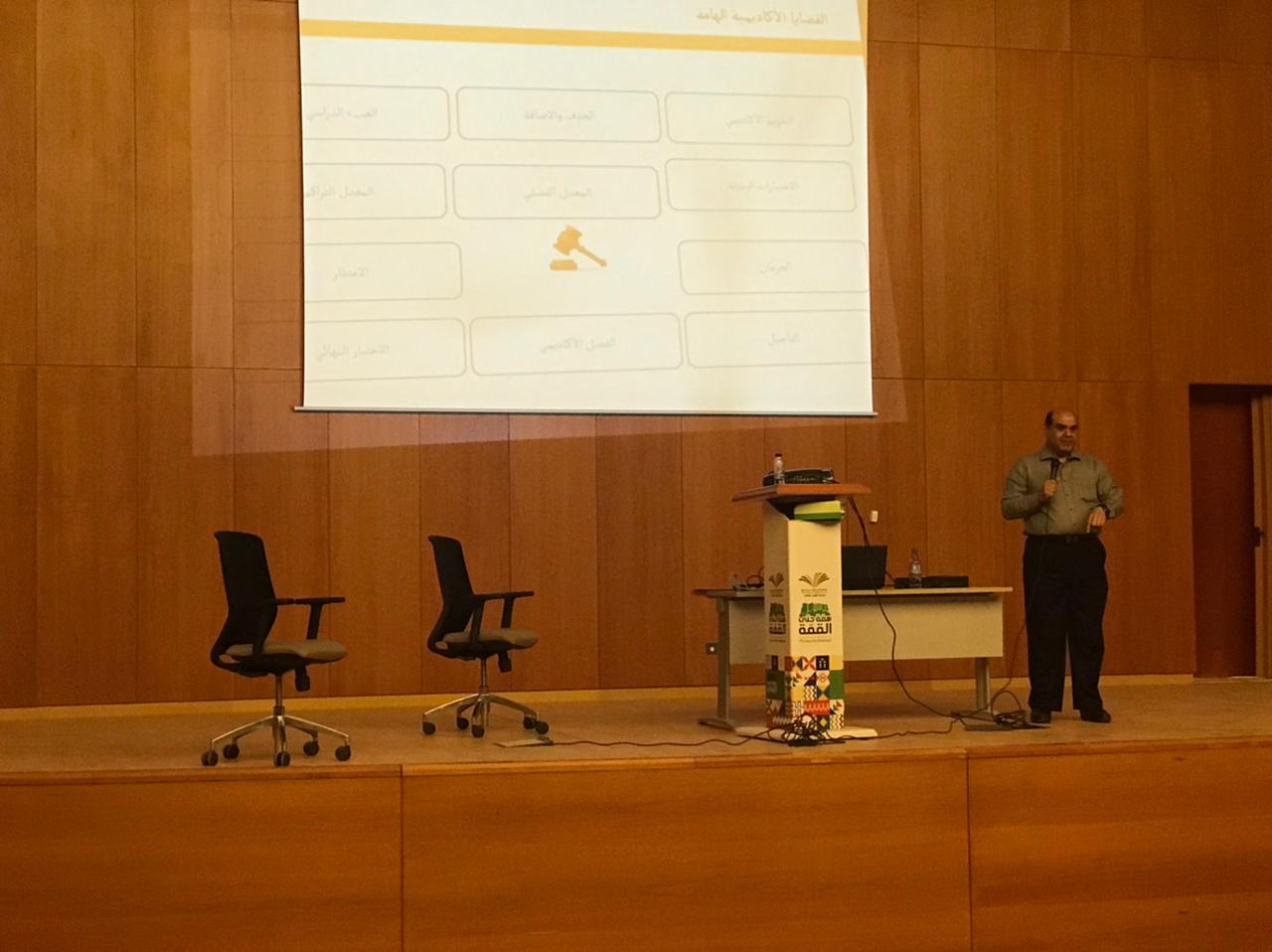 وقد تناولت ورشة العمل أهم القضايا التي تواجه الطالب الجامعي أثناء فترة دراسته مثل مكافأة التفوق والعبء الدراسي للطالب، والمعدل الفصلي، والمعدل التراكمي، وكيفية حسابه، والاختبارات الفصلية والنهائية والبديلة، وأيضا الإنذار الأكاديمي، والاعتذار عن مقرر وعن فصل دراسي، وطي القيد، والرسوب والتأجيل، والإيقاف والانسحاب من الجامعة، والآثار المترتبة عن كل منها. وفي نهاية اللقاء أجاب سعادته على كافة أسئلة الطلاب.