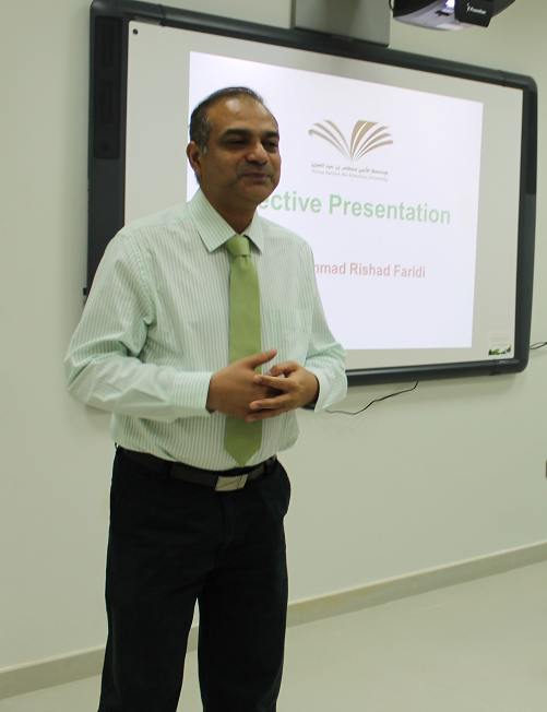 نظمت لجنة الأنشطة الطلابية بكلية إدارة الأعمال محاضرة تثقيفية بعنوان (Effective Presentation ) قدمها الدكتور محمد رشاد فريدي، الأستاذ المساعد بقسم التسويق بالكلية، برعاية عميد الكلية الدكتور ناصر القحطاني، حيث تناول الدكتور فريدي تعريف وتطور أساليب العرض وتقنياته مؤكدًا على أن العرض يجب أن يكون ثريًّا بالمعلومات المقدمة وليس فقط بالألوان والتنسيقات، مشيرًا إلى أهمية البساطة في العرض ووضوح الأسلوب مع الحرص على تقديم ألوان وصور مبسطة مما يجعل العرض ممتعًا، مع تجنب اختيار الأفكار والحلول الصعبة على الحاضرين، كما وجه سعادته عددا من النصائح للحضور من أهمها نصيحته بضرورة التحدث عن تجارب وقصص ناجحة في مجال الأعمال، محذرًا من تحول العرض إلى محاضرة من جانب واحد مؤكدًا على أنه لكي ينجح العرض ويكون على أكمل وجه يجب أن يكون الحديث في المجال الذي تفضل العمل به . كما تم بنهاية المحاضرة السحب على جوائز تشجيعية للطلاب الحضور .