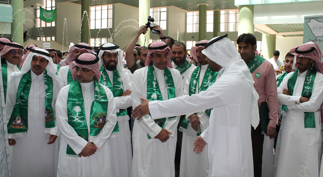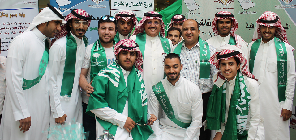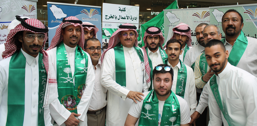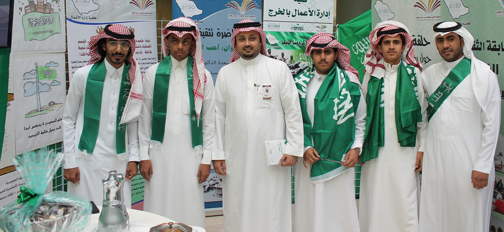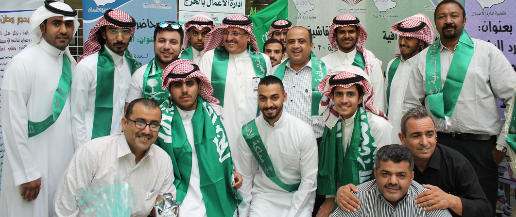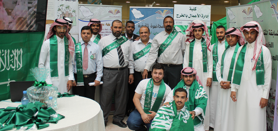 خلال معرض اليوم الوطني الذي نظمته عمادة شؤون الطلاب في ختام الاحتفالات باليوم الوطني شاركت كلية إدارة الأعمال بجناح مميز حظي بالعديد من الزيارات والمشاركات الطلابية حيث تضمنت الاحتفالات أوبريت بعنوان " طموح وطن " وفيلم وثائقي بعنوان " إلى القمة يا وطني " بجانب كلمة لمعالي مدير الجامعة الدكتور عبد الرحمن بن محمد العاصمي وكلمة لعمادة شؤون الطلاب ألقاها وكيل العمادة الدكتور ثلاب بن عبدالله الشكرة ، بجانب تكريم الفائزين في المسابقة الوطنية حيث نالت الكلية جائزة لمشاركتها تسلمها سعادة عميد الكلية الدكتور ناصر بن سعد القحطاني بجانب جائزة " أفضل رسالة لجنودنا المرابطين " للطالب يوسف بدر عبد العزيز الجريد ، تسلمها عنه سعادة الدكتور طارق توفيق الخطيب رئيس لجنة الأنشطة الطلابية بالكلية . وجدير بالذكر أن الكلية قدمت عدداً مكثفاً من الفعاليات خلال أسبوع الاحتفال باليوم الوطني تنوعت ما بين المحاضرات التثقيفية والحلقات النقاشية لرؤية 2030 والندوات والفعاليات الرياضية والثقافية.