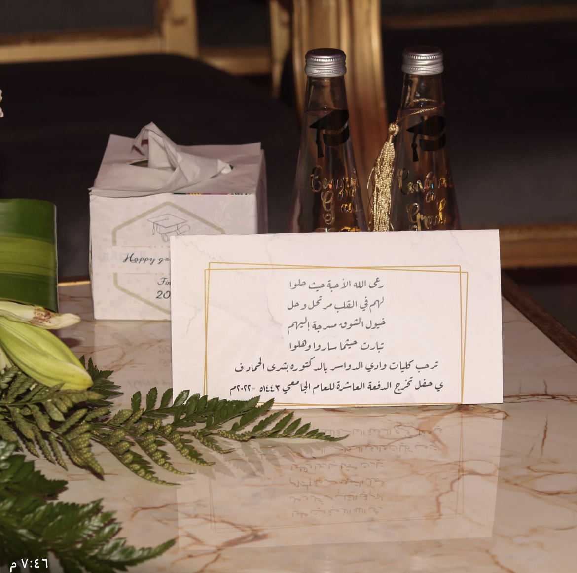 في ليلة يملؤها الفرح والسرور وبرعاية كريمة من الدكتورة بشرى الحماد وكيلة الجامعة لشؤون الطالبات احتفلت كليات وادي الدواسر بتخريج الدفعة العاشرة من طالباتها يوم الاربعاء ٢٥- ٥- ٢٠٢٠ م / ٢٤- ١٠-١٤٤٣هـ ؛ حيث بدأ الحفل بآيات من الذكر الحكيم، ثم النشيد الوطني