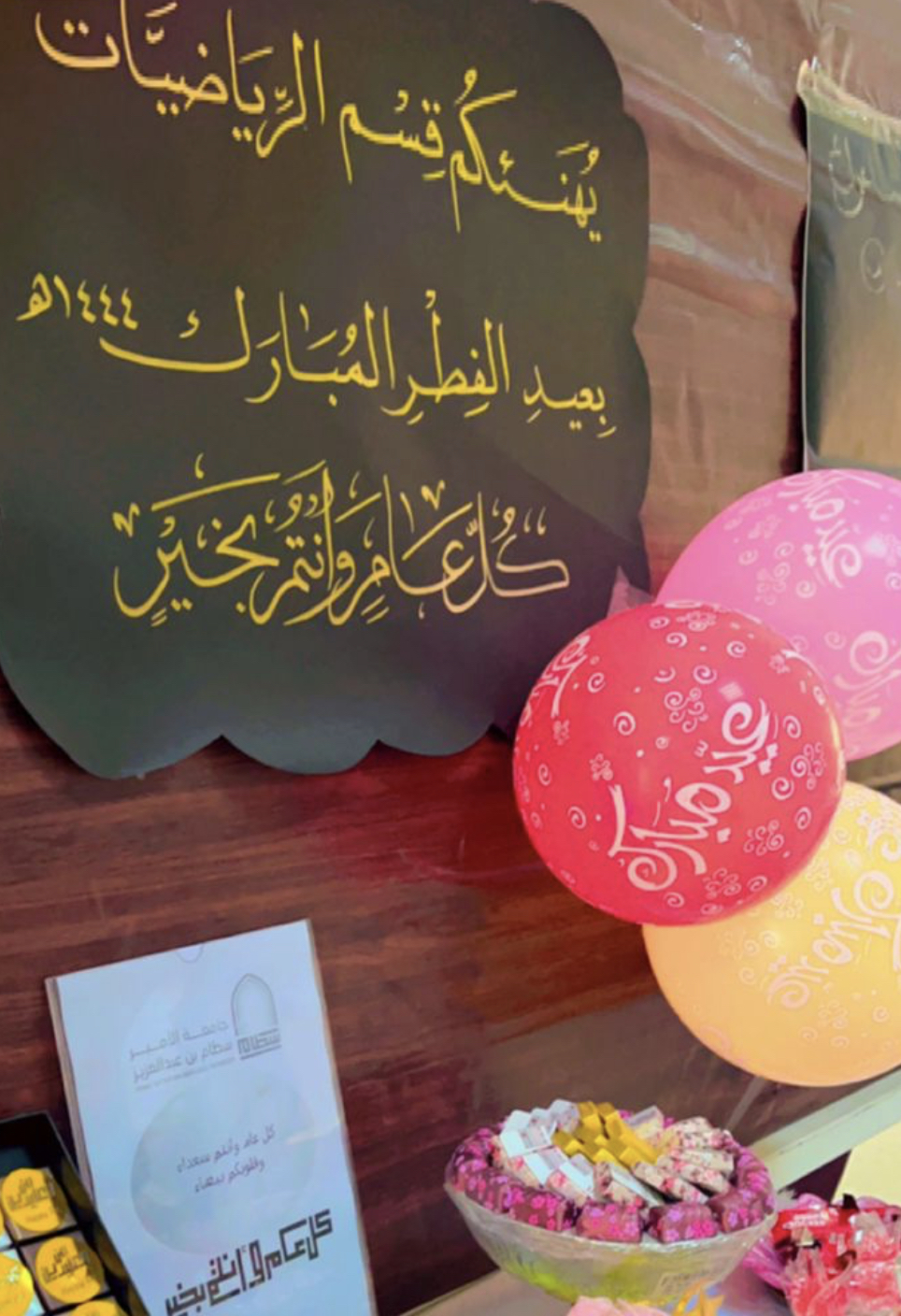 أقامت وحدة الأنشطة الطلابية بقسم الرياضيات كلية الآداب والعلوم بوادي الدواسر قسم الطالبات يوم الثلاثاء ١٢/١٠/١٤٤٤ احتفالًا بمناسبة عيد الفطر السعيد وقد ساهم في تفعيل هذه المناسبة مساعدة رئيس القسم الدكتورة/أميرة سالم ومنسقة وحدة الأنشطة الدكتورة/ مشاعر مريع الصعيدي وبصمة مميزة من أعضاء القسم الدكتورة/ هياء سعيد الدوسري والدكتورة/ عائشة بطحان الدوسري والأستاذة/ نورة المدرع.