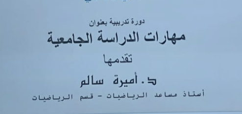 قدمت الدورة التدريبية د/ أميرة سالم عواد – أستاذ مساعد بقسم الرياضيات- والتي تناولت خلال العرض أهم الفروق بين متطلبات المرحلتين الثانوية والجامعية، وما المطلوب من طالبة الجامعة أن تلتزم به حتى تستطيع على التأقلم مع الحياة الجامعية.