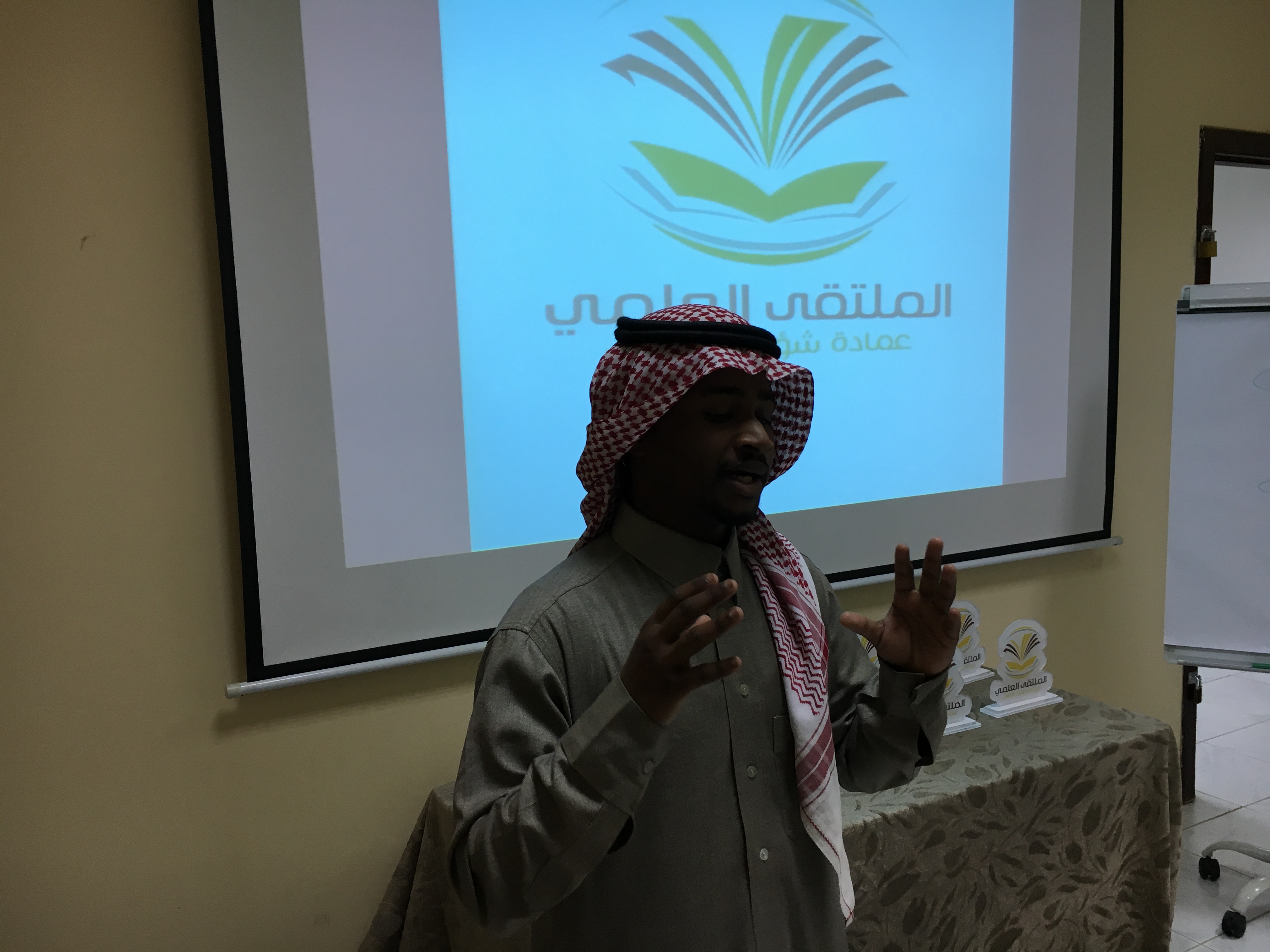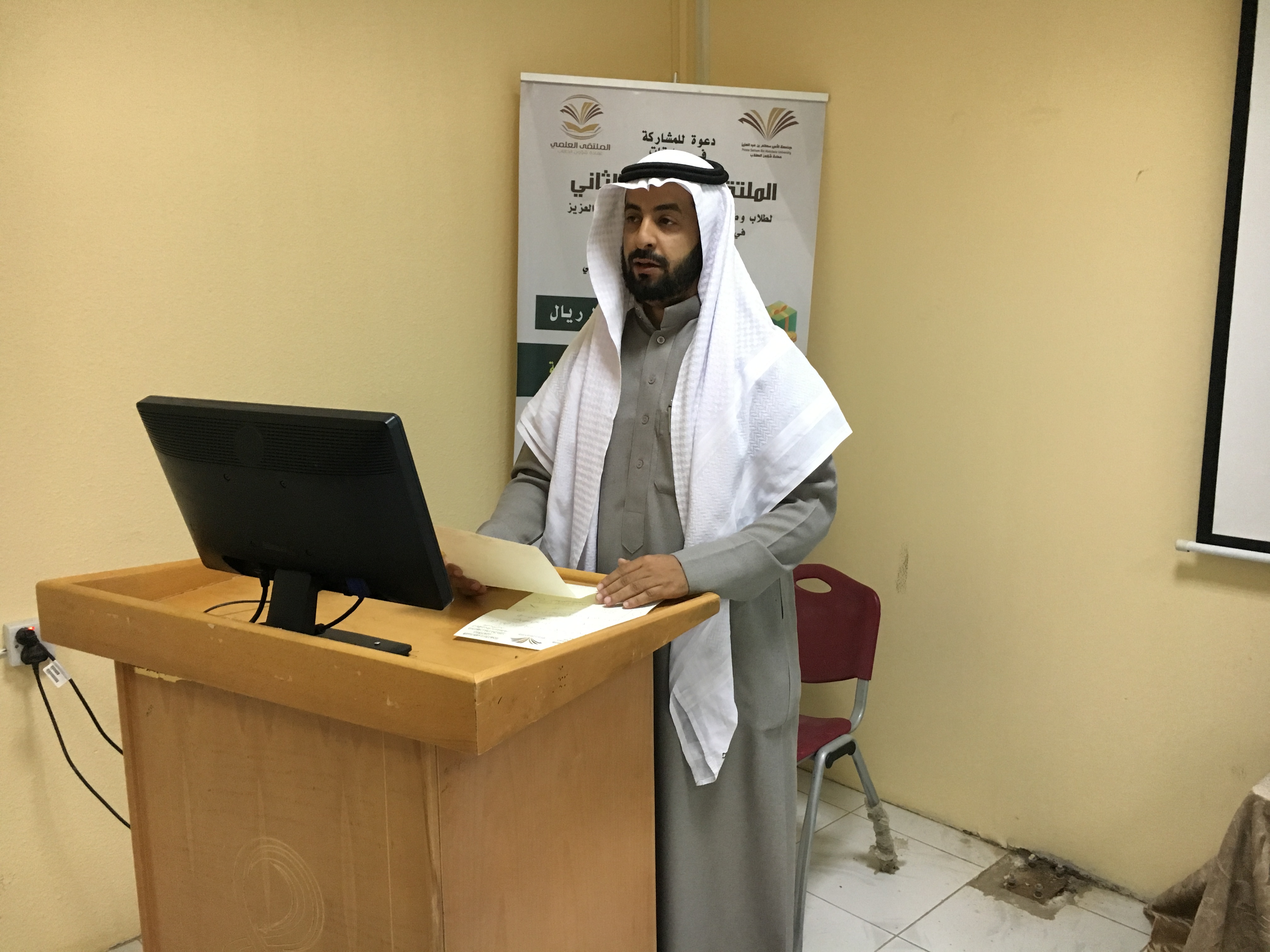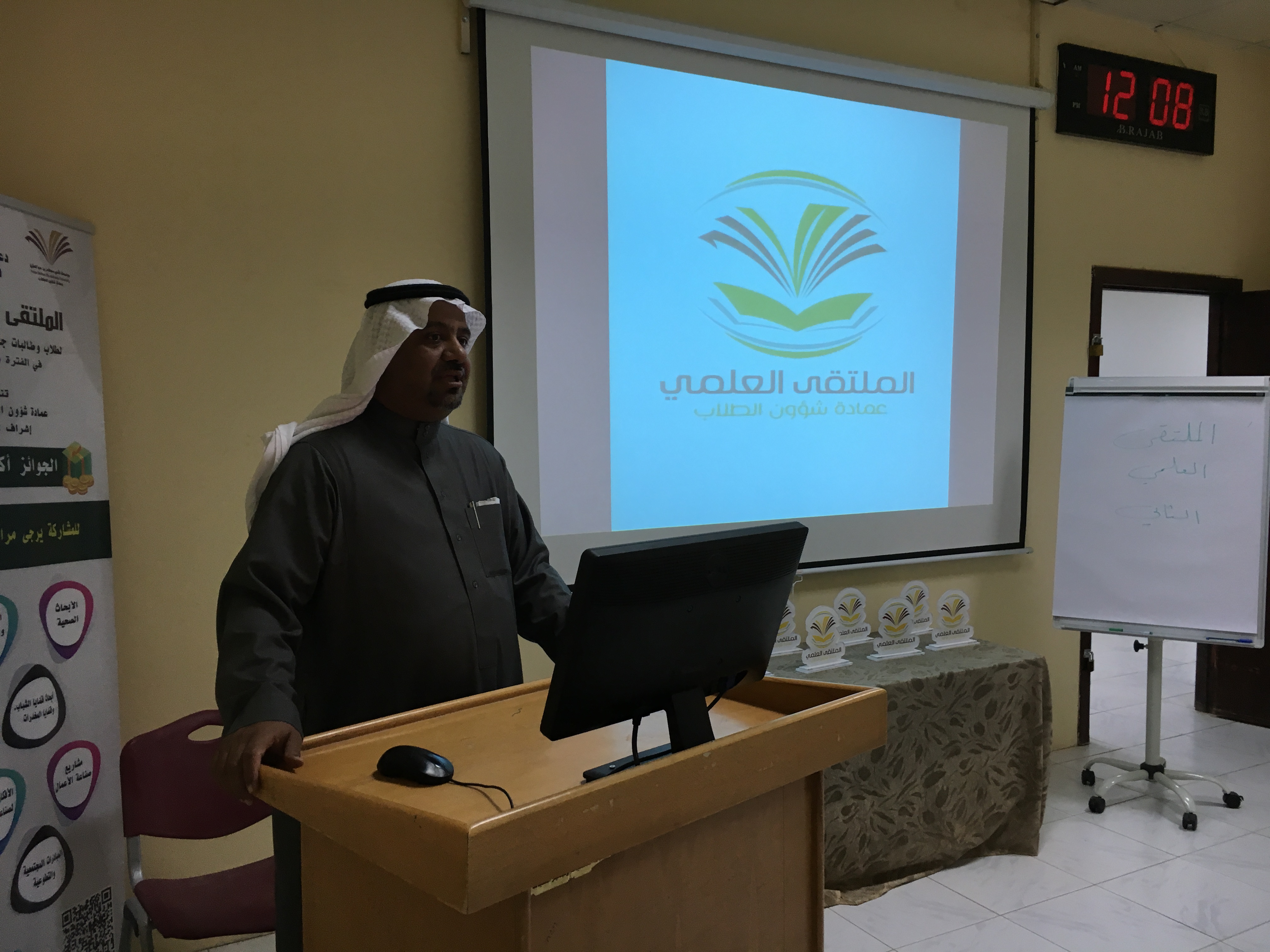 تلى ذلك كلمة لعميد عمادة شؤون الطلاب حث فيها الطلاب على التميز والإبداع في المشاركات العلمية وأثنى على جهود الكلية في التحضير للملتقى ، بعد ذلك عرض مجموعة من الطلاب المشاركين بأبحاث ومشاركات علمية ثقافية في محاور متنوعة وذلك بعرض مشاركاتهم أمام الحضور .