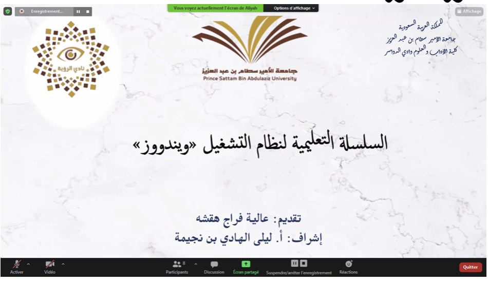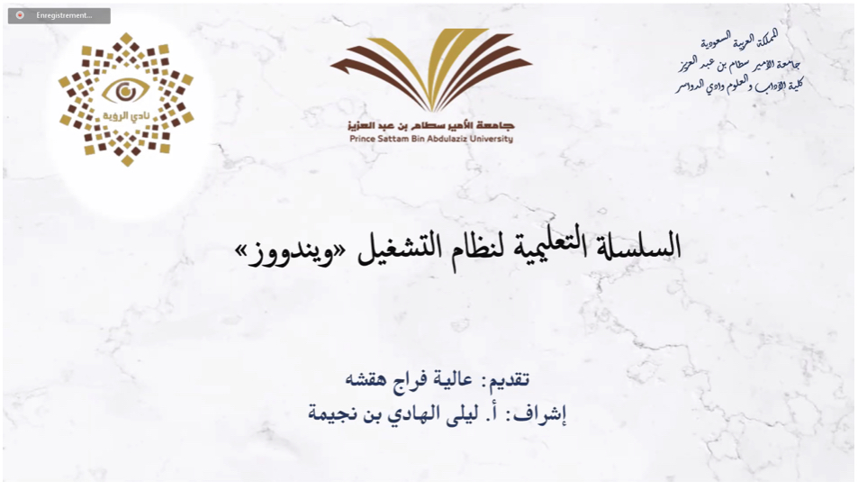 تواصلا لتألقها و تميزها قدمت الطالبة عالية فراج عبد الله هقشه عضوة نادي الرؤية سلسلتها الثانية و الثالثة تكملة للسلسلة الأولى لدورتها التدربية و التي كانت بعنوان " السلسلة التعليمية لنظام التشغيل «الويندووز» " و ذلك يوم الأحد 01 / 08 / 1442 هـ الساعة00: 7 مساء و يوم الأحد 08 / 08 / 1442 هـ الساعة00: 7 مساء على التوالي تحت إشراف الأستاذة ليلى بن نجيمة..