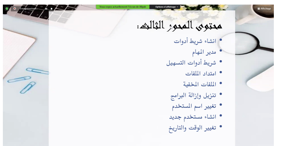 حيث اشتمل اللقاء الأول على النقاط المذكورة و هي : البداية مع نظام ويندوز , مرفقات الحاسب , شريط المهام وايقونات سطح المكتب , النوافذ, الملفات والمجلدات , إعادة التسمية وتبديل اللغة , حذف العناصر والملفات , اختيار العناصر وعرضها ,ترتيب وتجميع العناصر و تغيير خلفية الشاشة.