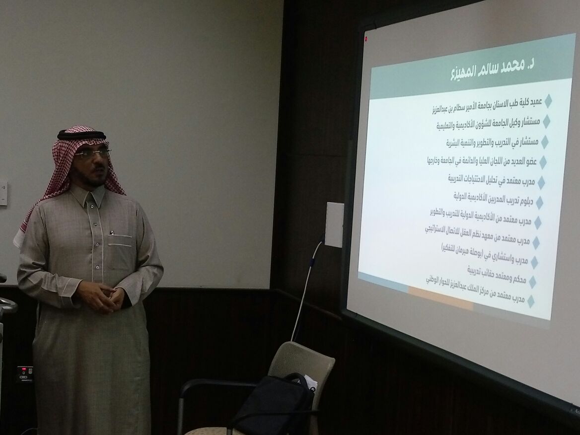 ( نحو تفكير ناجح ) قدمها سعادة الدكتور/ محمد بن سالم المهيزع عميد كلية طب الأسنان واستشاري إصلاح وتجميل الأسنان ، حيث تطرق الدكتور المهيزع للتفكير الإيجابي وتعريفه وأهميته ، كما تحدث عن التفكير والمؤثرات التي تؤثر عليه ، ثم بين الطرق والوسائل التي من خلالها يمكن أن يعيش الشخص في حياة أكثر أمان.