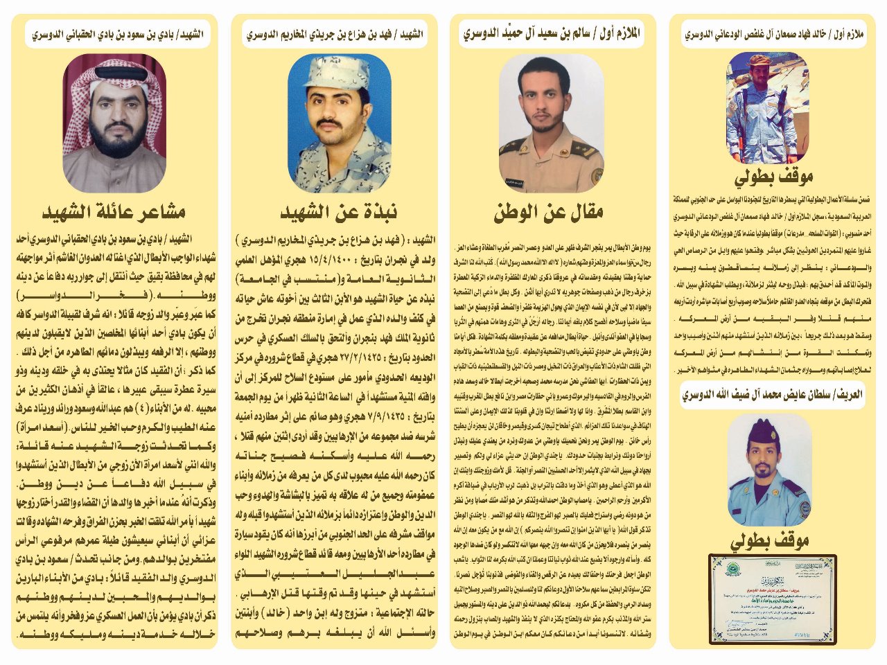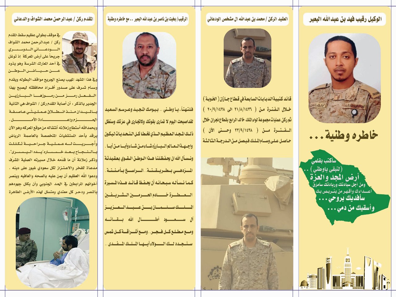 في ليلة عنوانها الوفاء وتكريم أبطال هذا الوطن المعطاء قامت كلية الهندسة بوادي الدواسر بتكريم أبطال المحافظة المصابين على الحد الجنوبي وأبناء الشهداء .