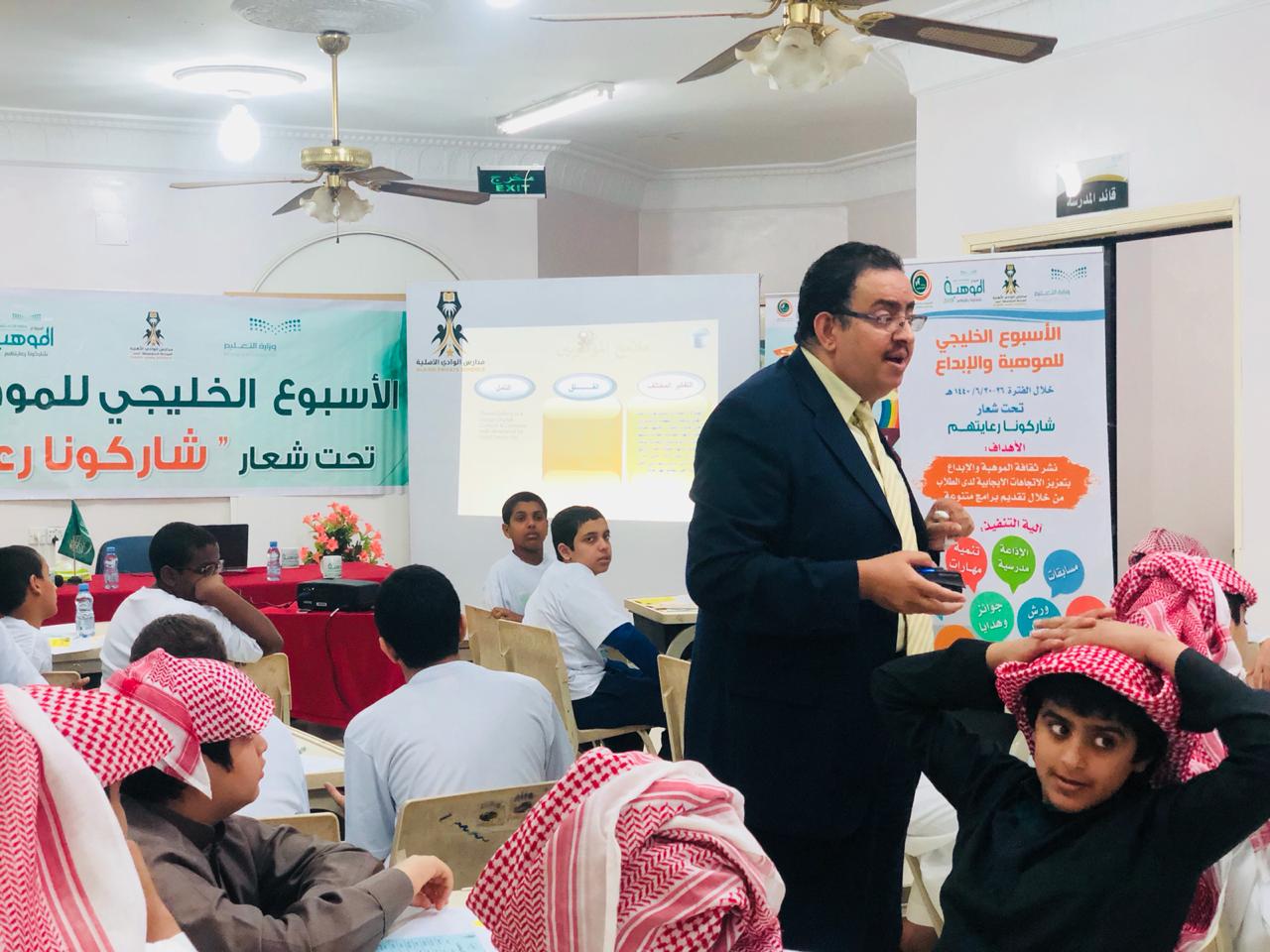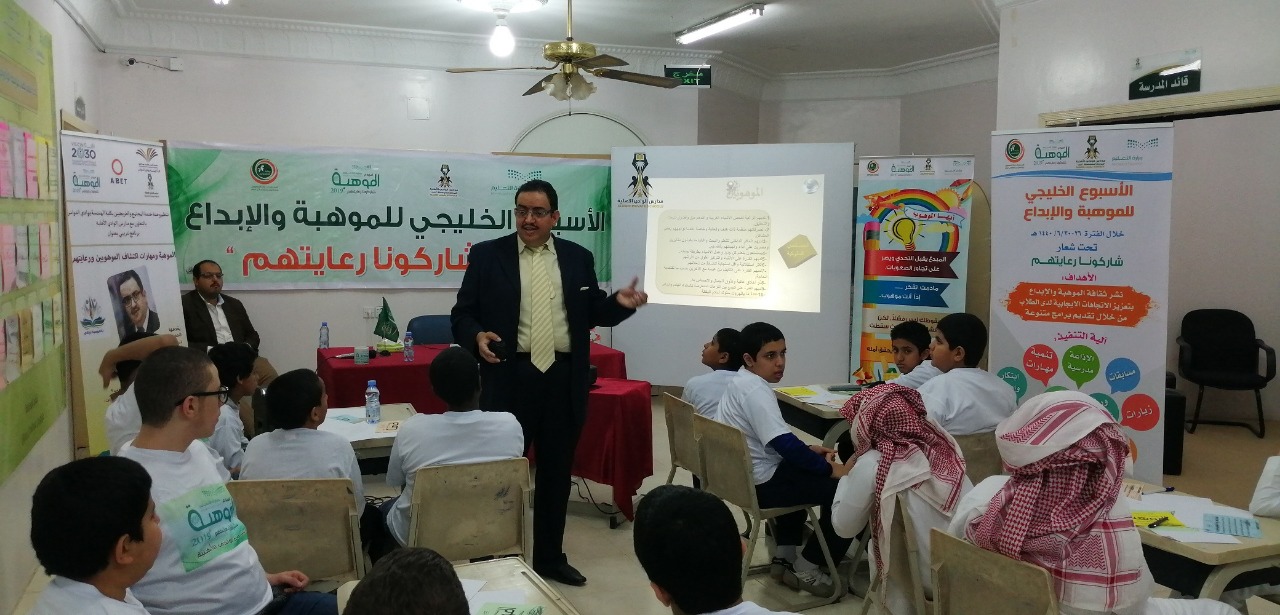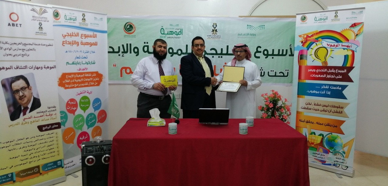 في رحاب متوسطة الوادي الأهلية نظمت كلية الهندسة برنامج تدريبي "الموهبة ومهارات اكتشاف الموهوبين ورعايتهم " امتداداً لتفعيل عقد الشراكة المجتمعية المبرم بين كلية الهندسة ومدارس الوادي الأهلية وفي إطار أسبوع الموهبة الخليجية.