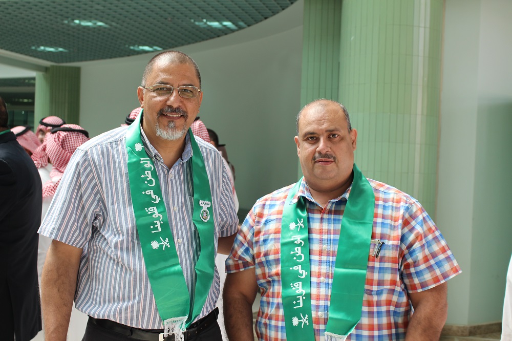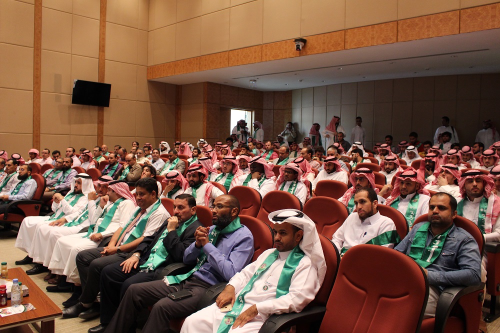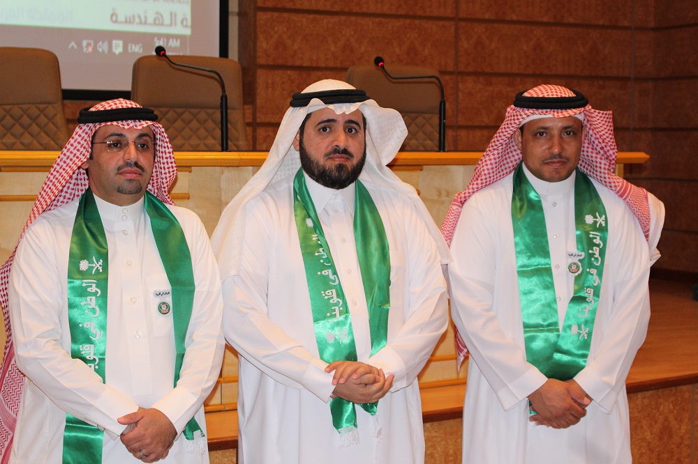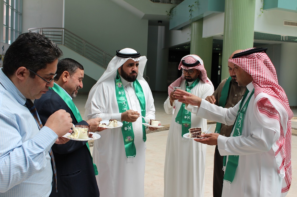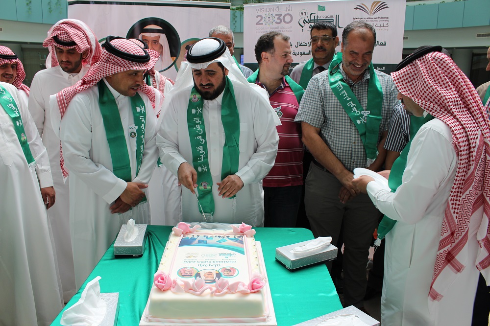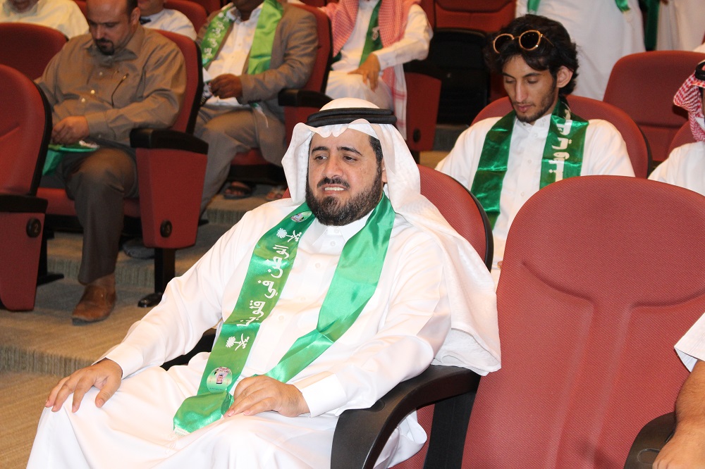 وبمشاعر معبرة عن جميع منسوبي الكلية ألقى سعادة عميد الكلية الدكتور محمد بن سعيد القحطاني كلمة عبر فيها عن مشاعر الاعتزاز والفخر والولاء للدين ثم المليك والإنتماء للوطن. حيث ذكر سعادته أننا في بلد الخير نحتفل بتوحيده ووحدته وليس كغيرنا من بقية الشعوب إذ يحتفلون باستقلالها ودحر مستعمريها. واستذكر سعادته الدور الريادي لمؤسس هذا الكيان الملك عبدالعزيز طيب الله ثراه وأبناؤه من بعده وما نقطفه من ثمرة جهودهم المباركة حتى أصبحنا نعيش واقع الأمن والأمان والرغد والإزدهار. وأضاف، أن حب الوطن والوطنية ليست شعارات ولا أهازيج، بل إنجاز وعمل وبناء.