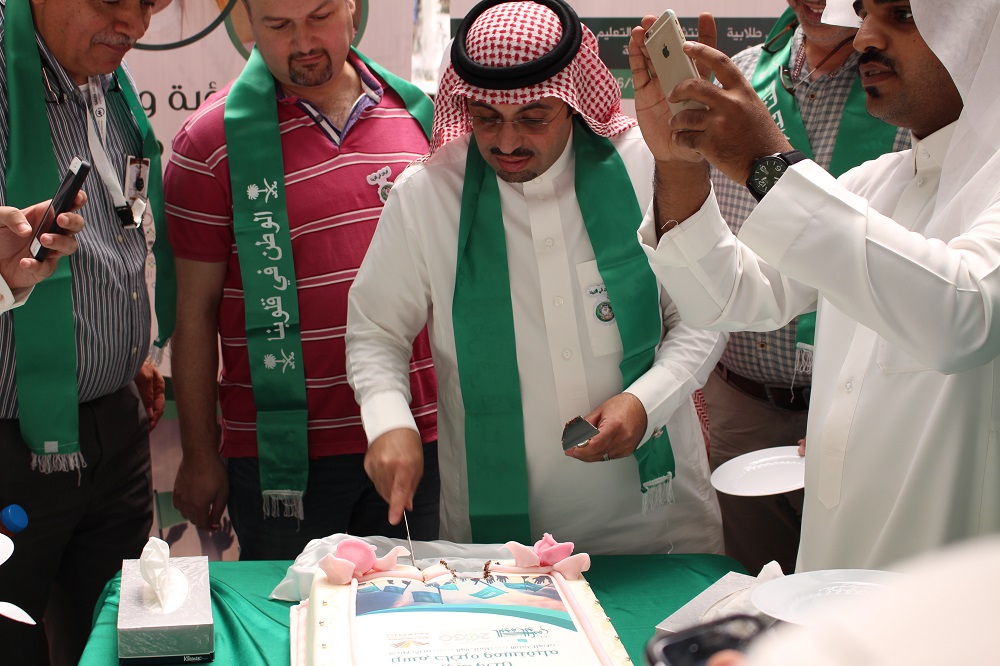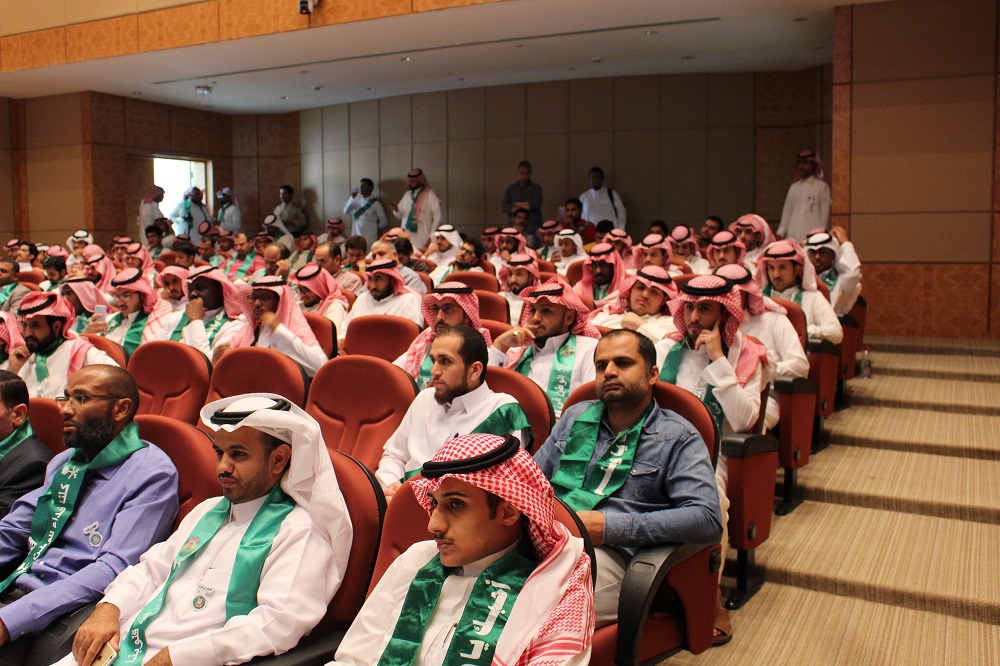 اتسمت فعالية اليوم الأول في إبراز جهود المؤسس الباني الملك عبدالعزيز بن عبدالرحمن طيب الله ثراه، عبرعرض فلم وثائقي عن توحيد المملكة ومراحل نموها وتطورها وكذلك جهود أبنائه من بعده والذين اسهموا في تطور ورقي هذا البلد المعطاء عبر عدة عقود من الزمن. كذلك كانت مشاعر أبناء الوطن من طلاب الكلية حاضرة، حيث شارك الطالب مشعل بن فائز الشهري بنشيد وطني عن ما تنعم به المملكة من أمن وأمان حيث هي مهبط الوحي ومنبع الرسالة.