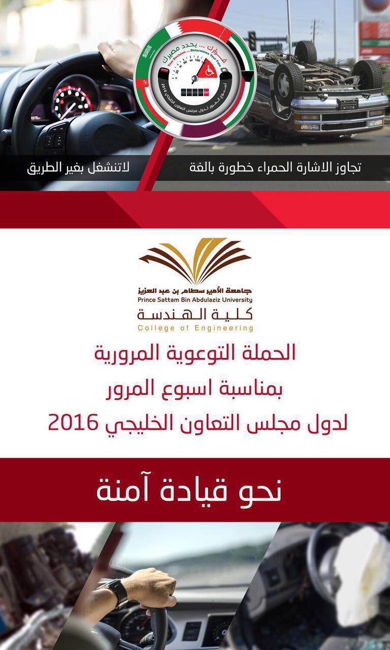 بدأت كلية الهندسة - ممثلة في وحدة الأنشطة الطلابية، وبتوجيه من عميد الكلية الدكتور محمد بن سعيد القحطاني- حملتها التوعوية المرورية بمناسبة أسبوع المرور لدول مجلس التعاون الخليجي 2016 والذي انطلق في العاصمة الرياض تحت شعار "قرارك.. يحدد مصيرك". وتستهدف الحملة منسوبي وطلاب الكلية عبر إيصال رسائل التوعية الارشادية لهم عبر العديد من الوسائل بهدف الإسهام في الحدّ من الحوادث المرورية وزيادة الوعي نحو الالتزام بأنظمة السير والمرور والتي وضعت من أجل سلامة الجميع.