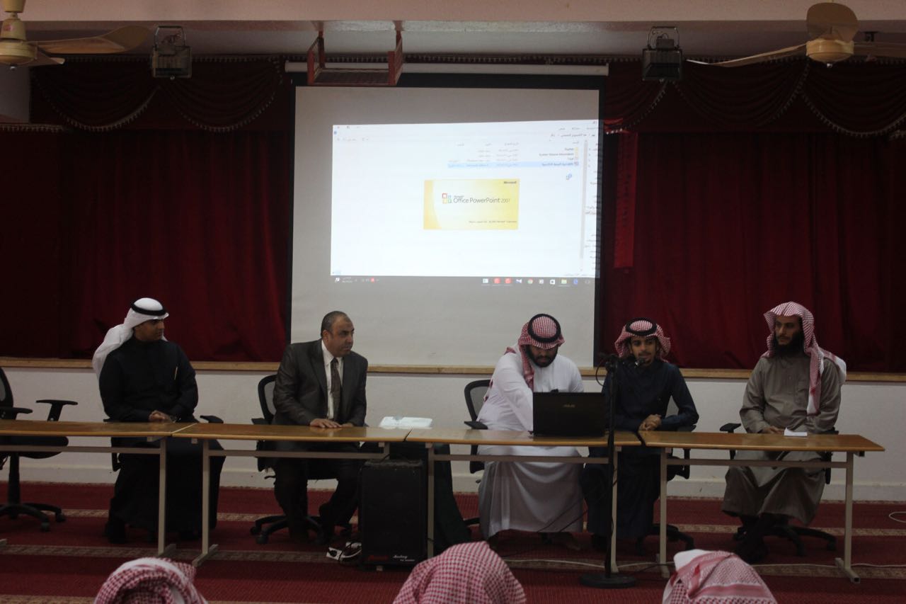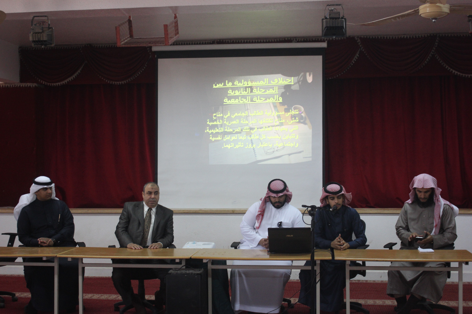 حيث أقام القسم ندوة بعنوان / التوعية الأكاديمية وقد كان في استقبال القسم قائد ثانوية نعجان الأستاذ / حمد بن فواز الفواز ، وقد أستقبل القسم بكل حفاوة من قائد المدرسة ، وتلى ذلك بداية الندوة ، حيث أفتتح الندوة الدكتور / عبدالباسط أبو العز وتحدث فيها عن أهمية مرحلة ما قبل المرحلة الثانوية وعن أهمية الحياة الجامعية لدى الطالب ، وتلى بعد ذلك كلمة ذلك كلمة لنائب رئيس المجلس الاستشاري الطالب/ المهند الحقباني تحدث فيها عن اختلاف تحمل المسؤولية للطلاب ما بين المرحلة الثانوية والمرحلة الجامعية وعن اجتياز مرحلة المراهقة الى مرحلة النضج والادراك ، ثم تلى بعد ذلك كلمة لرئيس الخدمة الاجتماعية الطالب/ عبدالعزيز الجوير وتحدث عن الصورة الخاطئة التي يتصورها بعض الطلبة عن قسم القانون ، وتحدث عن ماهية قسم القانون وعن مستقبله ثم اختتم الدكتور عبدالباسط أبو العز حديثه بشكره لإدارة ثانوية نعجان ممثلة في قائد المدرسة الاستاذ / حمد بن فواز الفواز وأعضاء هيئة التدريس والطلاب الحاضرين لهذه الندوة على ما لاقاه القسم من حسن تعاون و حفاوة وحسن إستقبال .