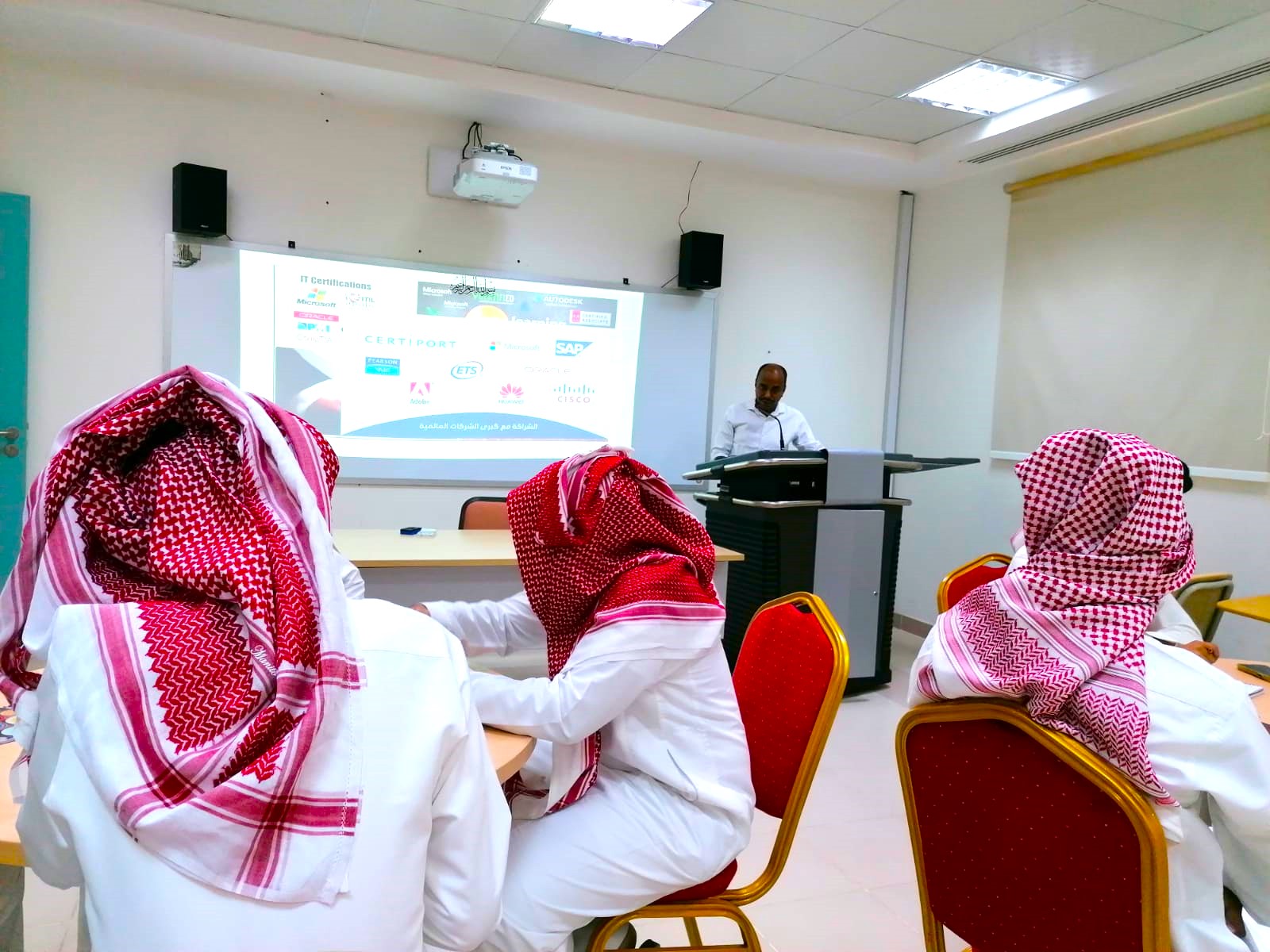 وقد قدم الدورة لقسم الطلاب مشرف قسم علوم الحاسب بالكلية الدكتور بشرى محمد الأمين، وفي قسم الطالبات الأستاذ المشارك بقسم علوم الحاسب الدكتورة منى جمال ،وكانت محاور الدورة حول ما يلي:التعريف بالشهادات الاحترافية وأهميتها في سوق العمل، والفرق بين الشهادات المهنية وبين الشهادات الأكاديمية وكيفية الحصول عليها، وأمثلة للشهادات المهنية والمؤسسات المانحة لها ومراكز الاختبارات المعتمدة، بالإضافة إلى قائمة الشهادات المهنية التي يدعمها صندوق تنمية الموارد البشرية" هدف" والخدمات التي يقدمها لتعويض المستفيدين عن تكاليف الحصول على الشهادات المهنية.