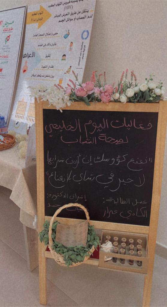 وقد شارك طالبات فريق "LIVE TO GIVE" التطوعي بالفعالية: قمن بعمل ركن توعوي، ومطويات، وتقديم توعية للطالبات والمشاركين تفعليا لليوم الخليجي لصحة اليافعين والشباب شملت الأمراض المعدية مثل الإيدز، الالتهاب الكبدي الوبائي، كيفية التغلب على الاكتئاب، وتقديم باركود يشمل ملف توعوي للتشجيع عى ممارسة الرياضة واتباع نظام غذائي متوازن. وقد شاركت الأستاذة رفعة عبدالرحمن في تحضير الركن مع الطالبات تحت إشراف منسقة البرامج التطوعية الدكتورة عطيات محمد حسن. وقد لاقت الفعالية استحسان وترحيب من الحضور. تم التنسيق والترتيب للفعالية من قبل مشرفة وحدة العمل الطلابي وخدمة المجتمع بالكلية الدكتورة عطيات محمد حسن.