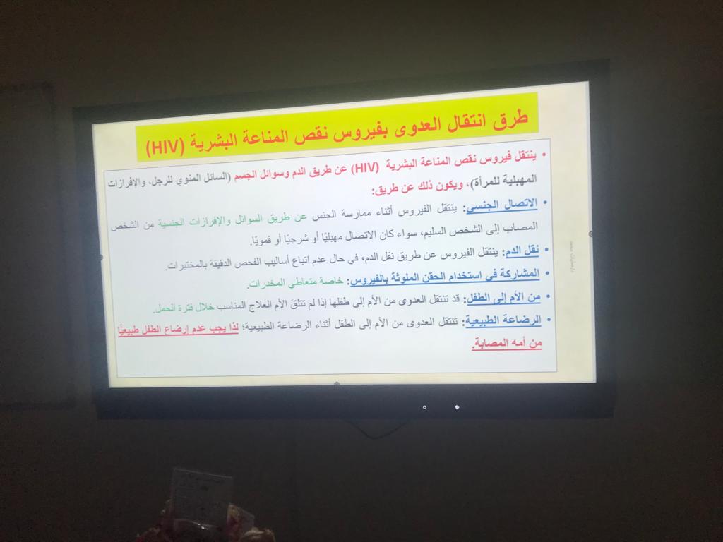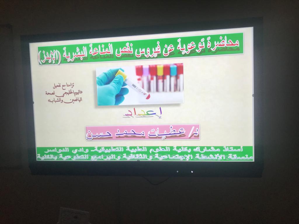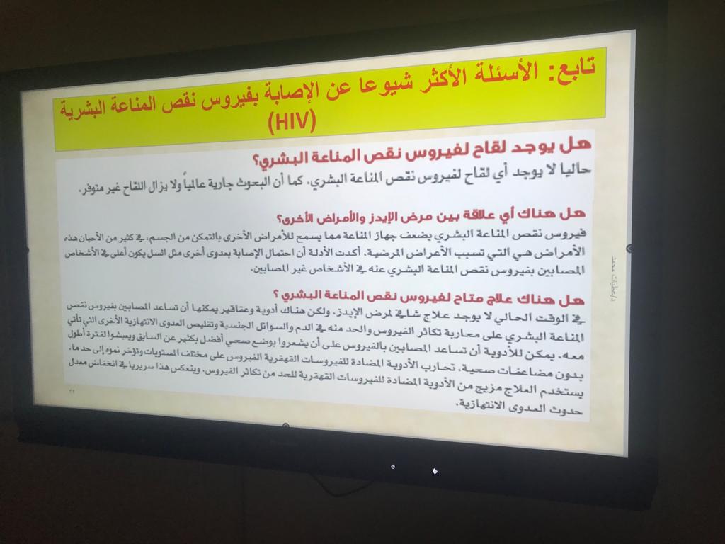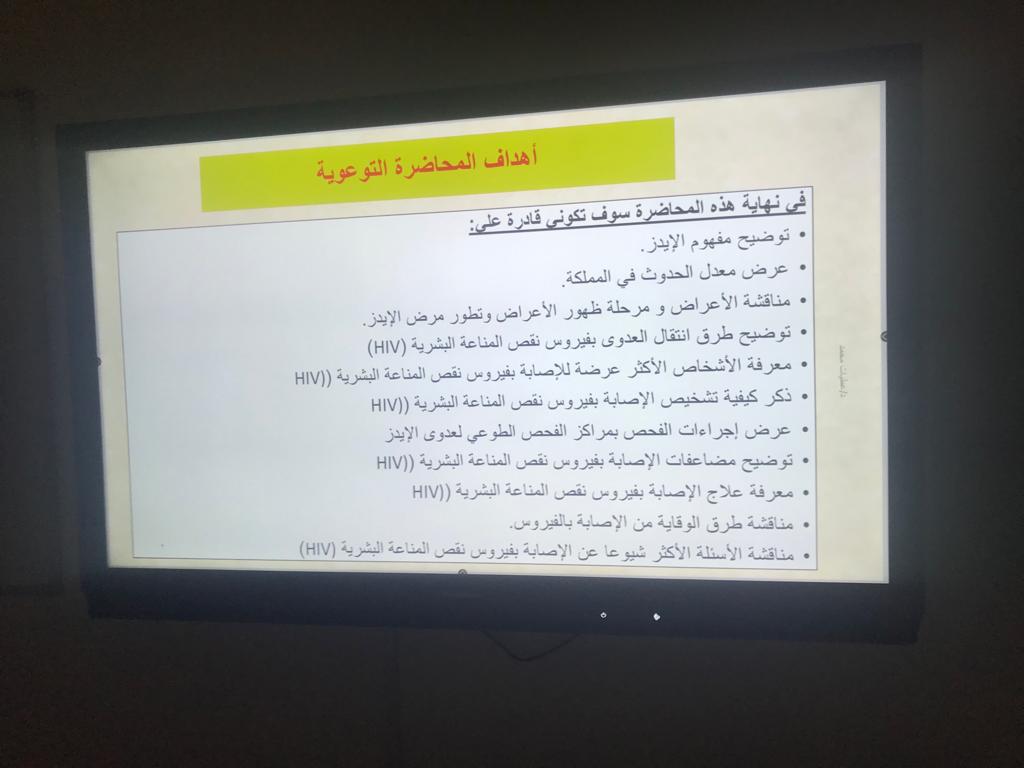 هدفت الفعالية إلي تسليط الضوء على الاحتياجات الصحية لفئة اليافعين والشباب المحصورة أعمارهم ما بين 10-24 سنة وتقديم التوعية الصحية اللازمة. وقد تم تقديم محاضرة توعوية عن مرض نقص المناعة البشري (الإيدز) قدمتها الدكتورة عطيات محمد حسن (أستاذ مشارك بقسم التمريض و منسقة الأنشطة الإجتماعية والثقافية والبرامج التطوعية بالكلية)، و أهم ما تناولته: تعريف الإيدز، ومعدلات إنتشاره في المملكة، أعراض المرض، طرق انتقال العدوى،الفئة الأكثر عرضه للإصابه بالمرض، المضاعفات، التشخيص، العلاج وطرق الوقاية و مناقشة الأسئلة الأكثر شيوعا عن الإصابة بفيروس نقص المناعة البشرية.
