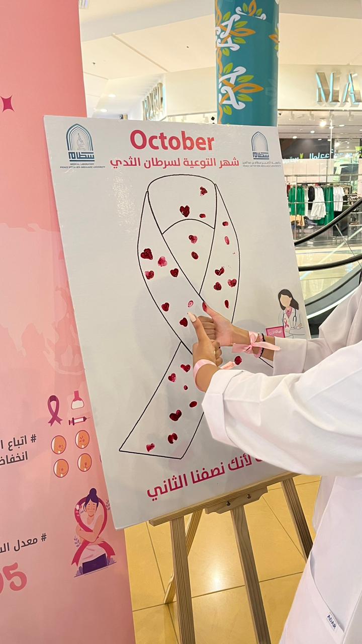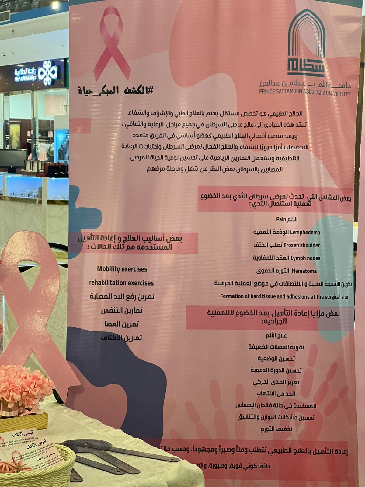 تزامنًا مع الشهر العالمي للتوعية بسرطان الثدي أقامت كلية العلوم الطبية التطبيقية ممثلة في وحدة خدمة المجتمع فعالية توعوية عن سرطان الثدى والحث على الكشف المبكر تحت شعار#الكشف_المبكر_حياة شاركت فيها جميع اقسام الكلية وذلك يومي الجمعة والسبت الموافق 20 -21 اكتوبر 2023 في مجمع الحديثي مول بالخرج.