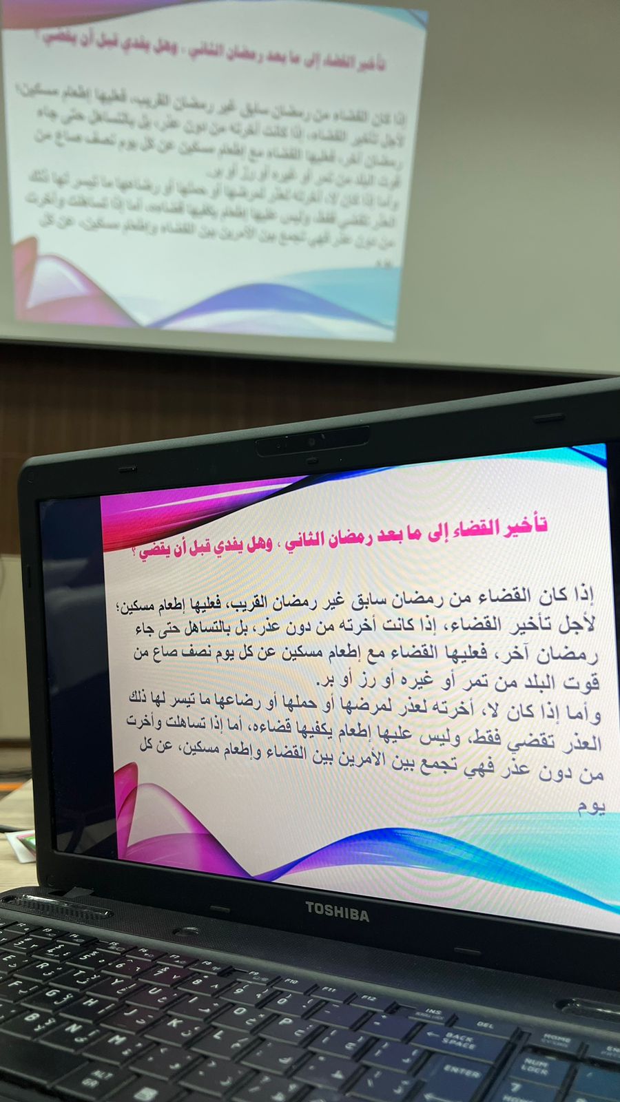 ثم استفاضت دكتورة رشا حيث قامت بشرح الركن الرابع من أركان الإسلام و هو الصيام، و الاستشهاد بالقرآن و السنة على هذه الفريضة و استحباب الطاعة و الأجر المضاعف في هذه الأيام المباركة المعدودة، التي يجب أن يلتزم بها الإنسان المؤمن و الإخلاص في الطاعة و الاجتهاد و العزم على ترك المعصية و التقرب إلى الله عز وجل.