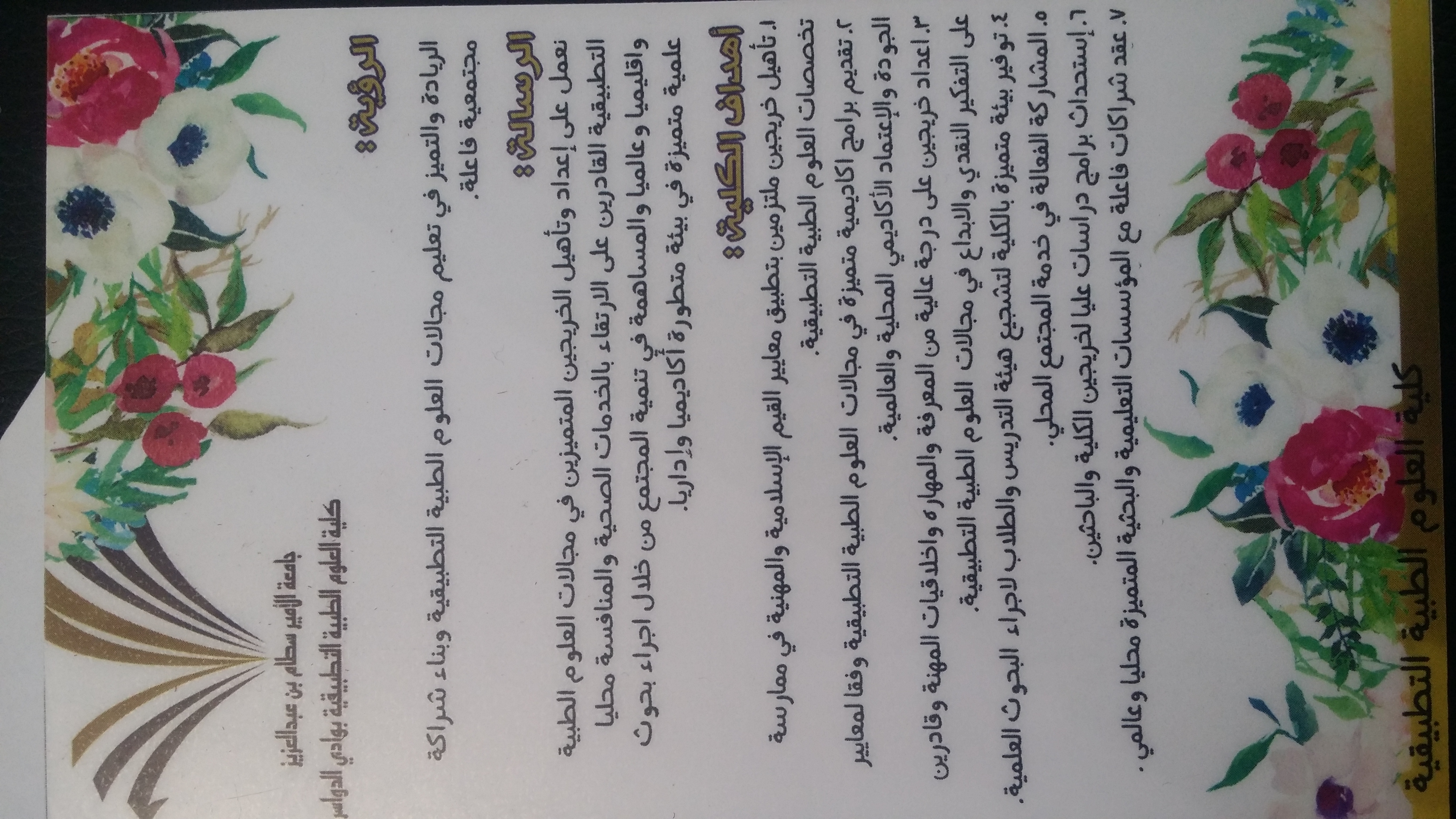 قامت كلية العلوم الطبية التطبيقية بوادي الدواسر بزيارة لمدرسة الخماسين الثانوية الثانية للبنات يوم الثلاثاء 10/7/1439هـ وتأتي هذه الزيارة ضمن الشراكة المجتمعية مع القطاعات الحكومية والأهلية والخاصة والتي تسعى إلى تنفيذ سلسلة من اللقاءات والزيارات بالمدارس بجامعة الأمير سطام بن عبدالعزيز وما تسعى إليه من تحقيق رؤية 2030والقاء الضوء على كلية العلوم الطبية التطبيقية بالوادي والتخصصات الصحية المتاحة بالوادي , والقاء الضوء على قيم وأهداف الكلية وما تطمح إليه رؤيتها ورسالتها من ريادة وتميز في تعليم مجالات العلوم الطبية التطبيقية.