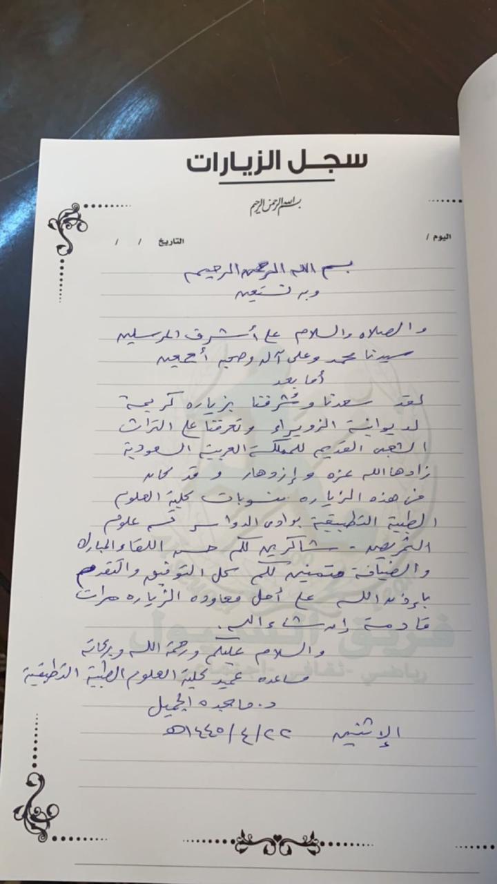 قامت كلية العلوم الطبية التطبيقية بوادي الدواسر شطر الطالبات - قسم علوم التمريض بزيارة مركز النشاط بالزويراء يوم الأثنين ٢٢/٤/١٤٤٥هـ، مُمثلة في وحدتي المسؤولية المجتمعية و الأنشطة الطلابية و حرصاً على تعريف المنسوبات بالتراث الشعبي.
