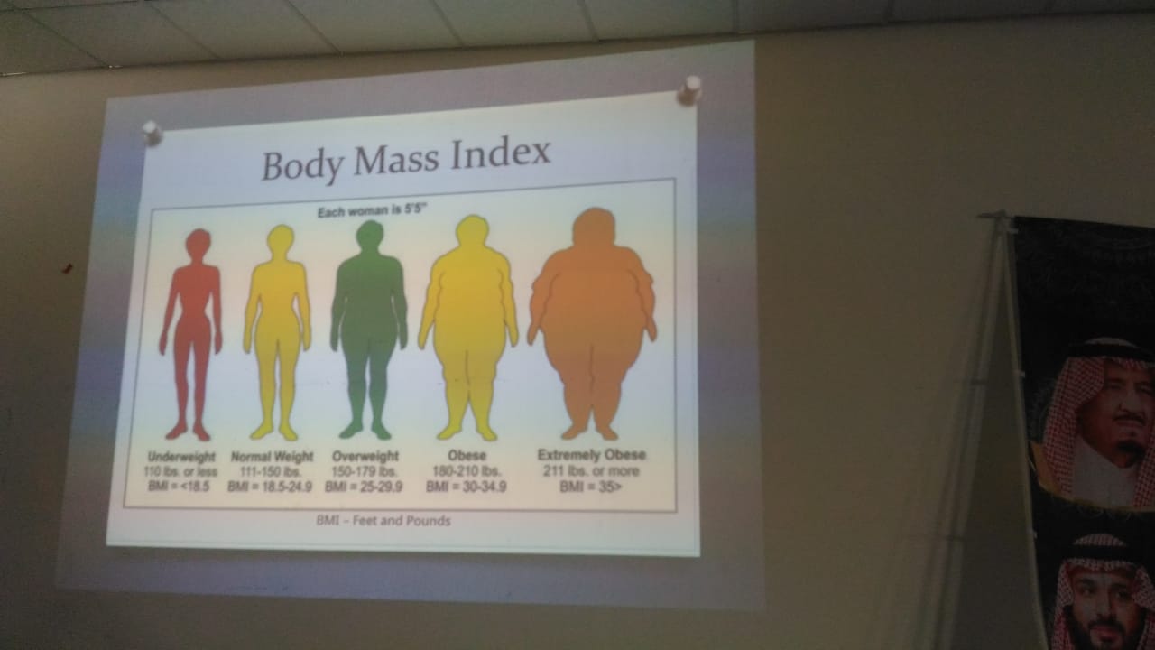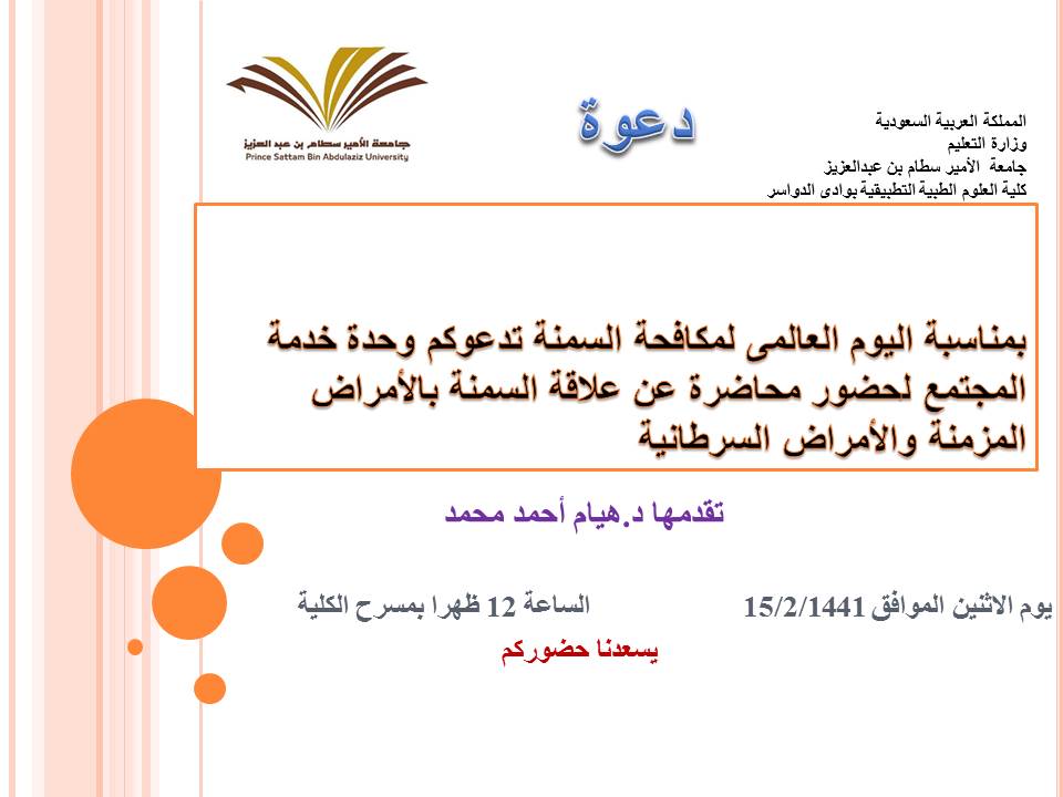 برعاية سعادة الدكتور ماجد آل شريدة المشرف على كلية العلوم الطبية التطبيقية وادى الدواسر وإشراف د.ماجدة الجميل مساعدة العميد لشؤون الطالبات نظمت وحدة خدمة المجتمع اليوم الإثنين الموافق ١٥/٢/١٤٤١ بمناسبة اليوم العالمى للسمنة محاضرة تثقيفة قامت بإلقائها د.هيام أحمد محمد الأستاذ المساعد بقسم علوم التمريض ومنسقة الوحدة بعنوان "علاقة السمنة بالأمراض المزمنة والأمراض السرطانية" حيث تحدثت عن أسباب ومخاطر السمنة وكيفية حساب كتلة الجسم ومدى ارتباط السمنة بالأمراض المزمنة والتعرض لبعض الأمراض السرطانية كما عرضت أهمية إتباع نظام غذائي صحى متوازن وممارسة الرياضة بصورة منتظمة لتجنب التعرض للسمنة وقد لقى العرض استحسان الحضور.