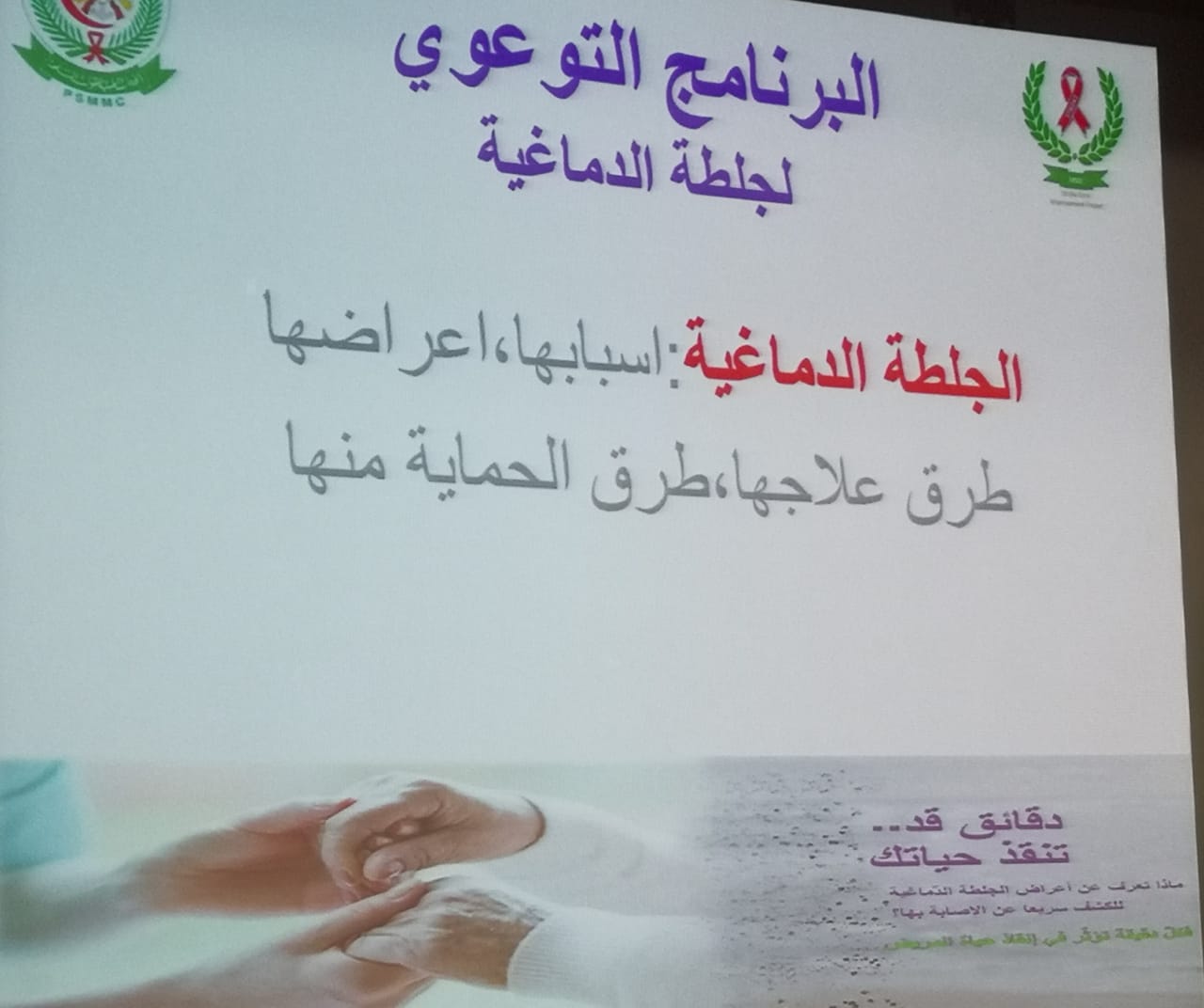 قامت وحدةالخريجات ممثله بمجال تنمية المهارات المهنية بكلية العلوم الطبيه التطبيقية بوادي الدواسر بالتعاون مع مستشفى القوات المسلحة بوادى الدواسر بعقد برنامج تدريبى بعنوان الربنامج التوعوى للجلطة الدماغية وتم عقد الدورة بالمركز الثقافى بمستشفى القوات المسلحة بوادى الدواسر وكانت الدورة موجهه للخريجات والمتوقع تخرجهم و الطلاب والطالبات . وكان هدف الدورة القاء الضوء على الجلطة الدماغية و احصائيات انتشارها بالمملكة و مفهومها و انواعها وعوامل الخطورة وارعراضها و ميفية الوقاية والعلاج . وفي الختام تتقدم وحدة الخريجات بكلية العلوم الطبيه تحت اشراف دكتورة ميرفت الكاشف بجزيل الشكر والتقدير لسعادة العميد الركن الدكتورحسن بن ماجد الدوسرى مدير المستشفى القوات المسلحة بوادى الدواسر على دعم هذا البرنامج التندريبى وندعو الله له بدوام التوفيق والسداد ونسال الله التوفيق لابنائنا الطلبة والخريجي