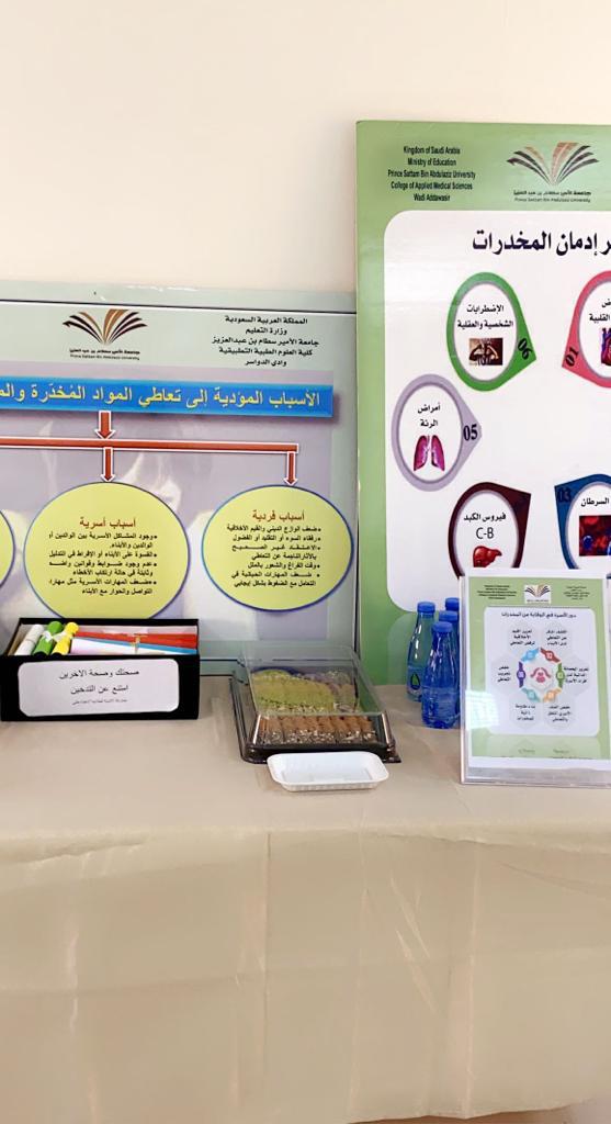 حرصا من كلية العلوم الطبية التطبيقية بوادي الدواسر على رفع وعي الطالبات بأضرار التدخين والمخدرات وإستمرارا للبرامج التوعوية نظمت وحدة العمل الطلابي بالكلية (ممثلة في البرامج التوعوية من أضرار التدخين والمخدرات والبرامج التطوعية) بالتعاون مع لجنة العمل المشترك مع المديرية العامة لمكافحة المخدرات في الجوانب التوعوية والتدريبية ولجنة مكافحة التدخين بالجامعة ندوة توعوية بعنوان « فعاليات الأسبوع الخليجي لمكافحة التدخين و المخدرات» وذلك يوم الخميس الموافق 21/ 8/ 1443هـ الساعة 11 صباحاً B-10 بالكلية. هدفت الندوة التوعوية إلى رفع الوعي لدي الطالبات و المنسوبات بمشكلات التدخين و المخدرات الصحية قدمتها سعادة الدكتورة ماجدة محمود الجميل ( مساعدة العميد لشؤون الطالبات وأستاذ مشارك بالكلية ) و قد تناولت أثناء الندوة: تعريف التدخين، المشكلات الصحية والاجتماعية والدينية والإقتصادية للتدخين، وكذلك الإدمان، أنواع المخدرات، أضرار المواد المخدرة، أسباب التعاطي، كيف يمكن التعرف على متعاطي المخدرات، الآثار السلبية للإدمان، و طرق الوقاية من المخدرات. وقد تم عمل ركن توعوي. وقد لاقت الفاعلية استحسان وترحيب من الحضور. تم التنسيق والترتيب للندوة من قبل منسقة البرامج التوعوية من أضرار التدخين والمخدرات والبرامج التطوعية بالكلية الدكتورة عطيات محمد حسن