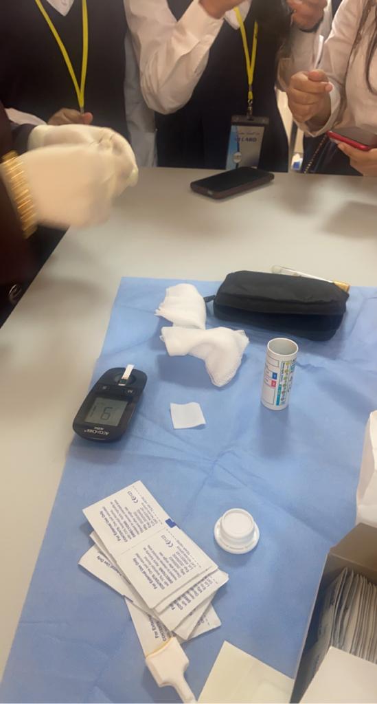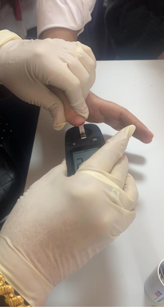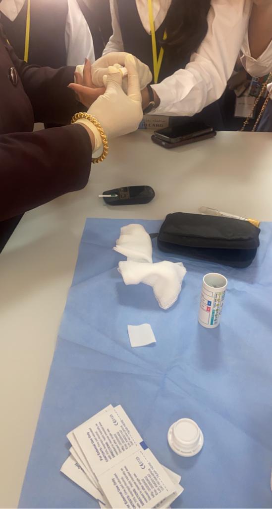 وقد قامت د ماجدة الجميل بفحص مستوى السكر بالدم للطالبات وقياس الوزن. وإعطاء إرشادات على اتباع نمط حياة صحي والمحافظة على الوزن المثالي وأهمية الكشف الدوري.