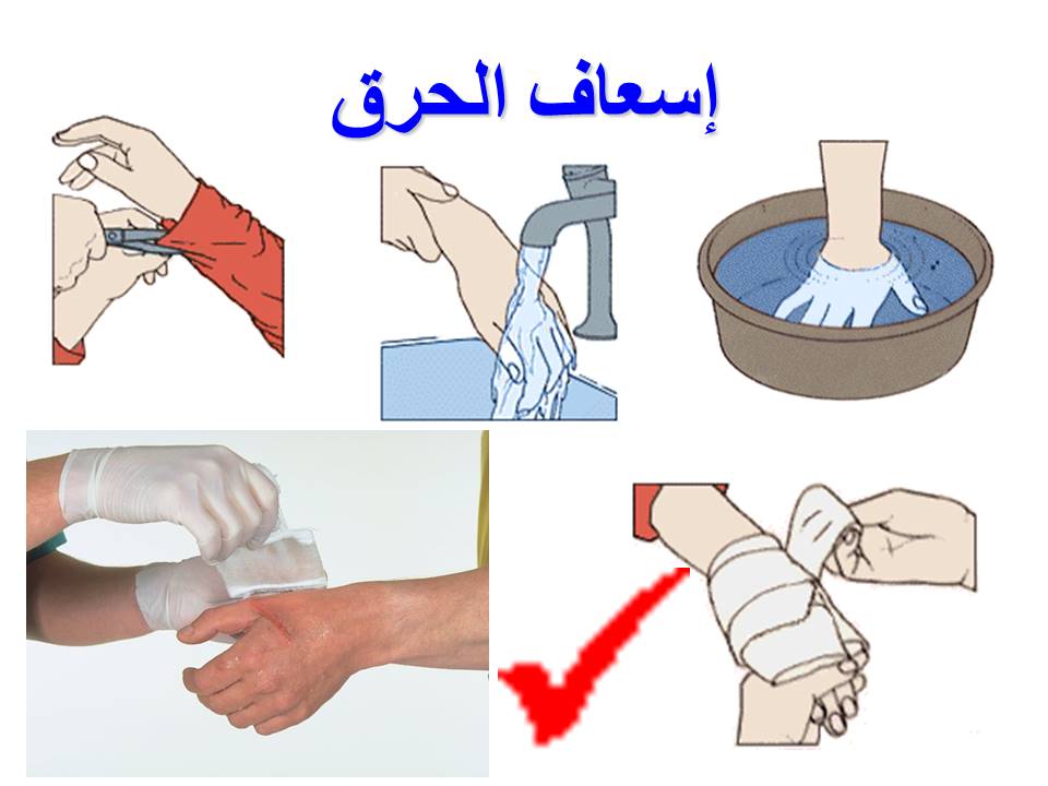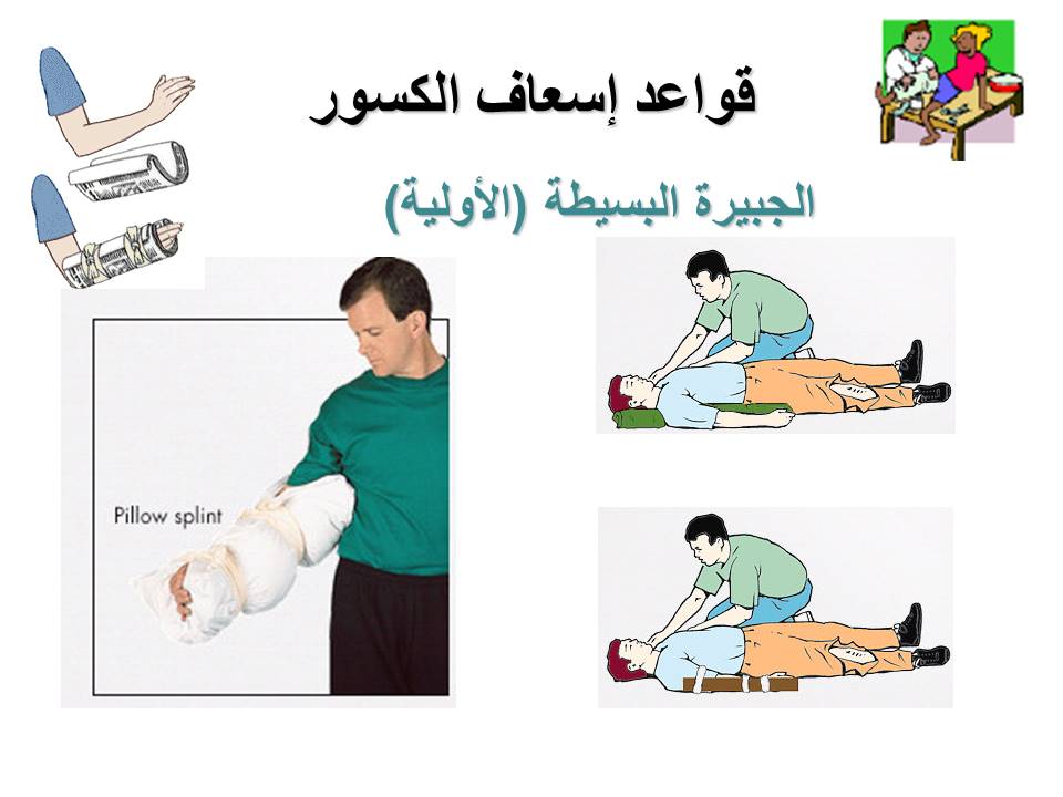 وايضا التعريف بأنواع الكسور والجبائر وكيفية تثبيت العضو او الطرف المكسور حتى نقل المصاب إلى المستشفى بأمان وسلام.