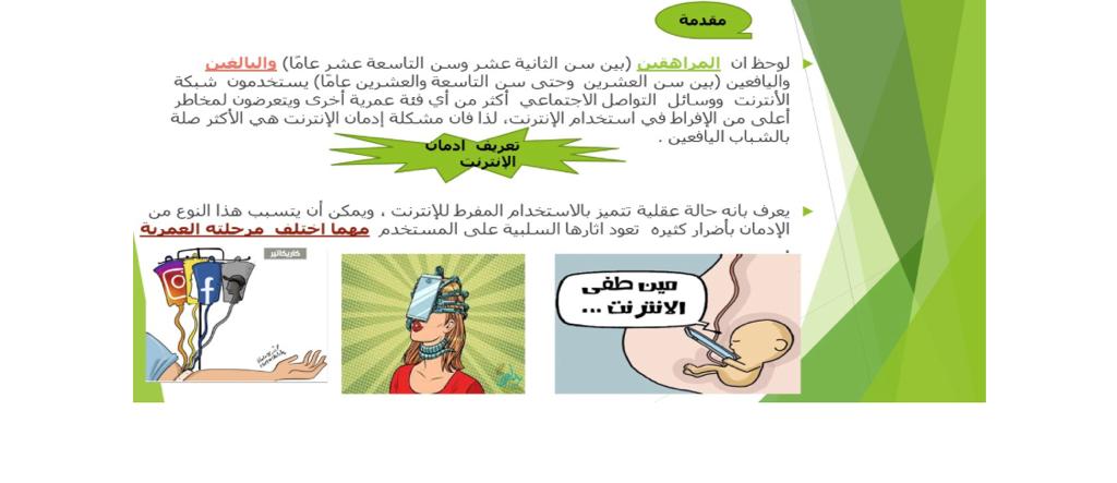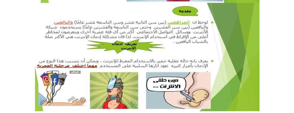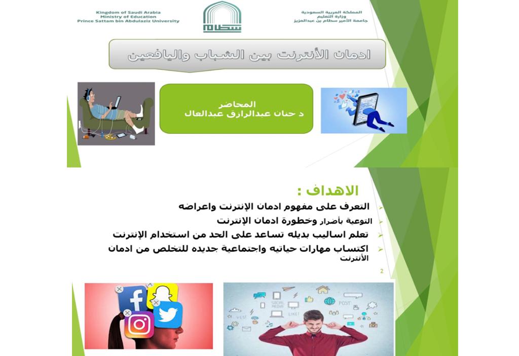 وكذلك تم تقديم محاضرة توعوية عن إدمان الأنترنت ووسائل التواصل الاجتماعي قدمتها الدكتورة حنان عبدالرازق (أستاذ مشارك بقسم التمريض) وأهم ما تناولته: تعريف إدمان الأنترنت وأسبابه و التوعية بأضرار وخطورة إدمان الإنترنت وكيفية تعلم أساليب بديلة تُساعد على الحد من استخدام الإنترنت.