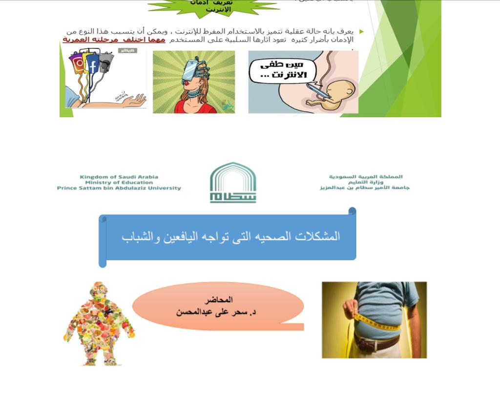 وقد تم تقديم محاضرة توعوية عن المشكلات الصحية التي تواجه فئة اليافعين والشباب قدمتها الدكتورة سحر على عبدالمحسن (أستاذ مشارك بقسم التمريض) و أهم ما تناولته: تعريف االسمنه ، ومعدلات إنتشارها ، المضاعفات وطرق الوقاية منها .