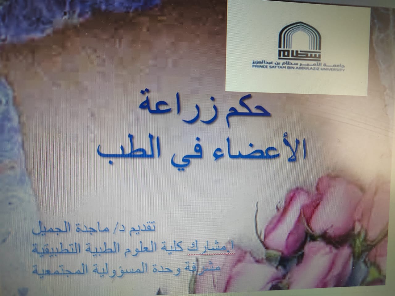 ثم تلتها سعادة الدكتورة ماجدة الجميل - مشرفة وحدة المسؤولية المجتمعية بكلية العلوم الطبية التطبيقية و التي بدورها قدمت تعريف زراعة الأعضاء، حكم الطب في زراعة الأعضاء، مكانة المملكة العربية السعودية و نجاحها في زراعة الأعضاء البشرية، حُكم الطب و شروط نقل و زراعة الأعضاء، تاريخ و تطور زراعة الأعضاء منذ القِدم لعصرنا الحالي.