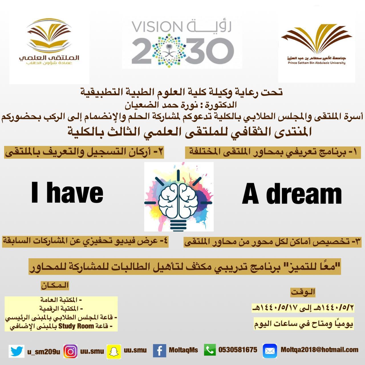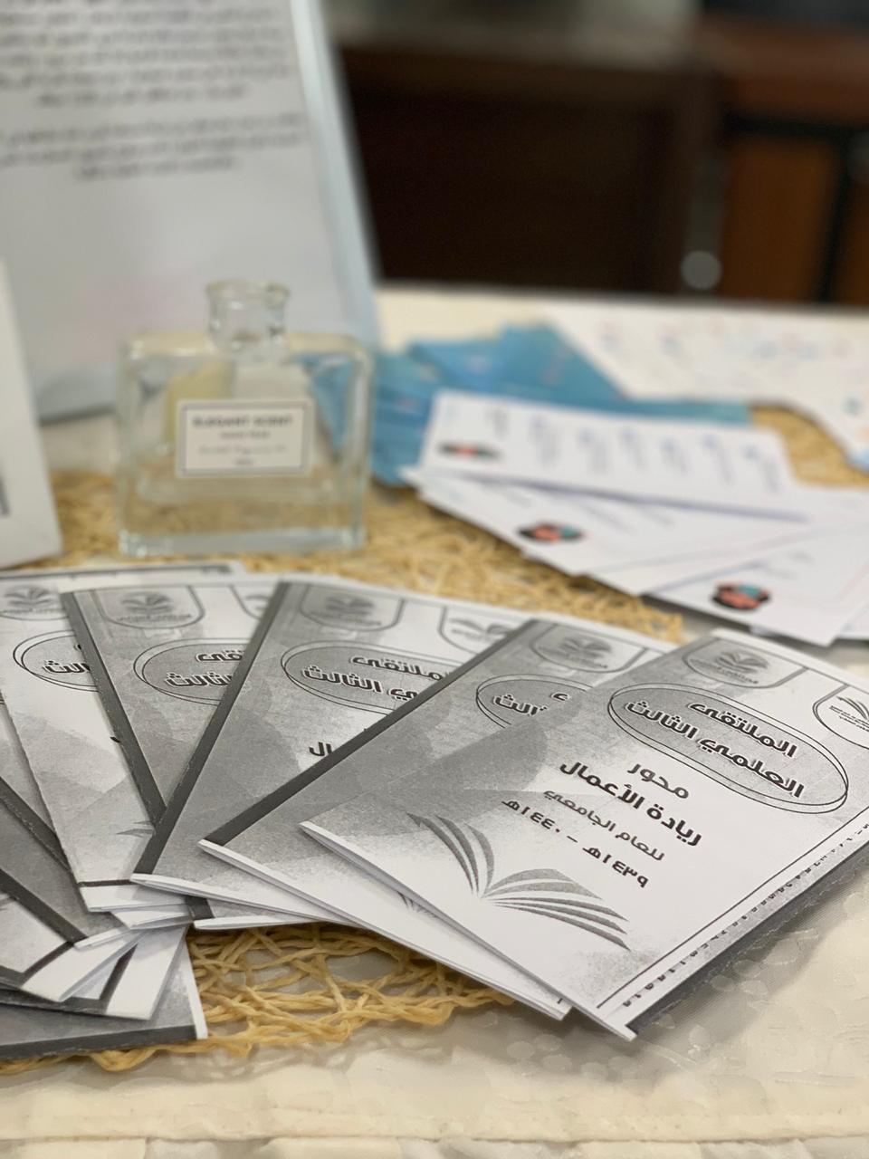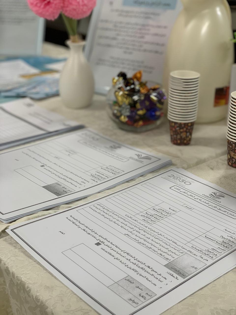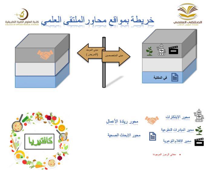 في اطار مراحل الملتقى المختلفة الدعائية والتأهيلية نظمت طالبات المجالس الطلابية بالكلية بإشراف من منسقة الملتقى د. حنان البحري أركان تعريفية من تاريخ 2/5/1440هـ والتي ستستمر فترة أسبوعين متتاليين من تاريخه ل٩حث وتحفيز الطالبات على المشاركة والرد على استفساراتهن حيث صممت بطريقة إبداعية واشتملت على نشرات تعريفية للملتقى ومحاورة المختلفة وطريقة المشاركة للطالبة والمواعيد التي تهمها بعد مشاركتها وحسابات التواصل الاجتماعي التي أنشئت لنشر وإعلان كل ما يخص الملتقى وما يستجد من أعمال بالإضافة الى شرح مفصل عن شروط المحاور وأهدافها وطريقة المشاركة والاعلان عن أماكن الأركان عن طريق خريطة مصممة ومعلنة للطالبات وقد لوحظ اقبال كبير على التسجيل الالكتروني من الطالبات و ندعو الله ان نجني ثمار هذه المرحلة بخروج مشاركات متميزة للطالبات