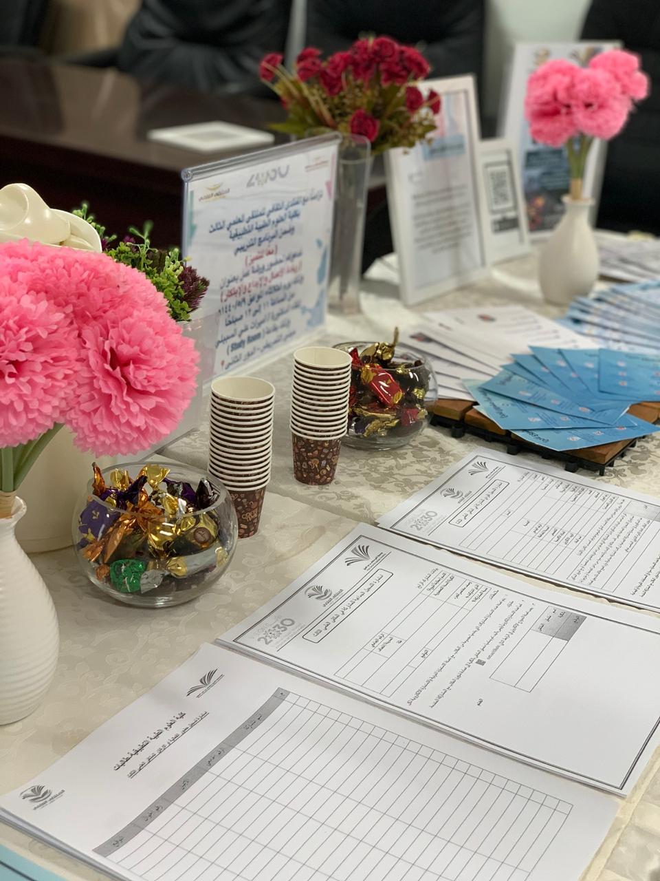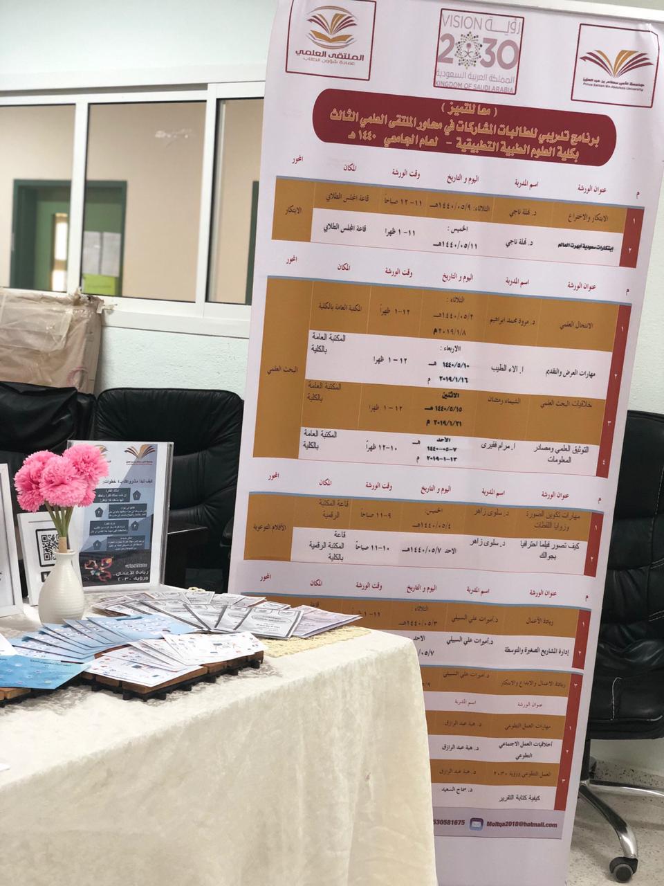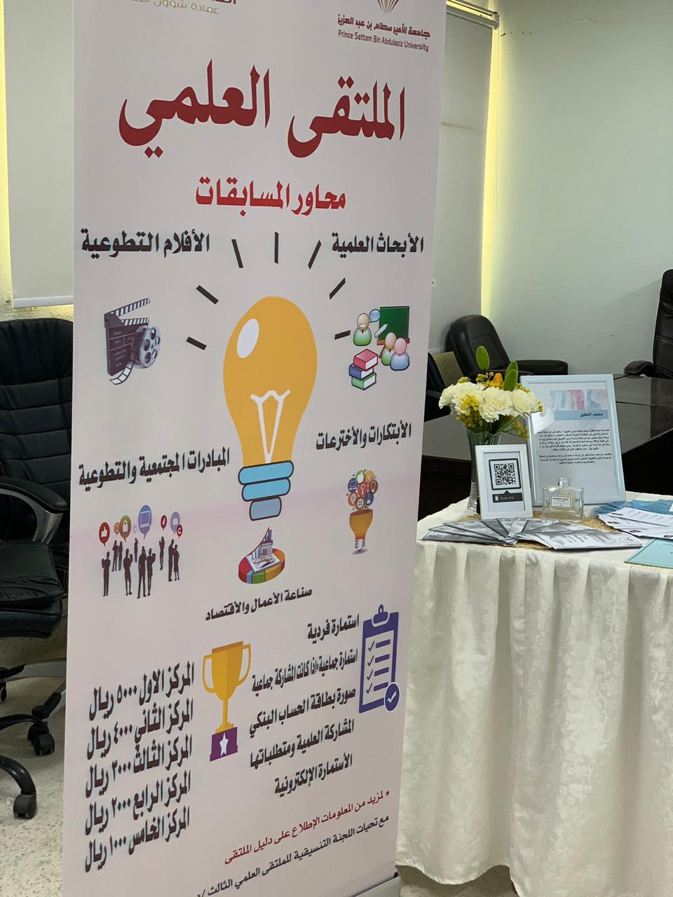 في اطار مراحل الملتقى المختلفة الدعائية والتأهيلية نظمت طالبات المجالس الطلابية بالكلية بإشراف من منسقة الملتقى د. حنان البحري أركان تعريفية من تاريخ 2/5/1440هـ والتي ستستمر فترة أسبوعين متتاليين من تاريخه ل٩حث وتحفيز الطالبات على المشاركة والرد على استفساراتهن حيث صممت بطريقة إبداعية واشتملت على نشرات تعريفية للملتقى ومحاورة المختلفة وطريقة المشاركة للطالبة والمواعيد التي تهمها بعد مشاركتها وحسابات التواصل الاجتماعي التي أنشئت لنشر وإعلان كل ما يخص الملتقى وما يستجد من أعمال بالإضافة الى شرح مفصل عن شروط المحاور وأهدافها وطريقة المشاركة والاعلان عن أماكن الأركان عن طريق خريطة مصممة ومعلنة للطالبات وقد لوحظ اقبال كبير على التسجيل الالكتروني من الطالبات و ندعو الله ان نجني ثمار هذه المرحلة بخروج مشاركات متميزة للطالبات