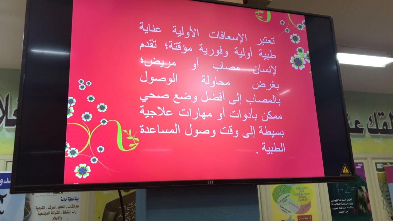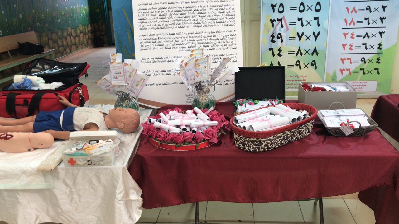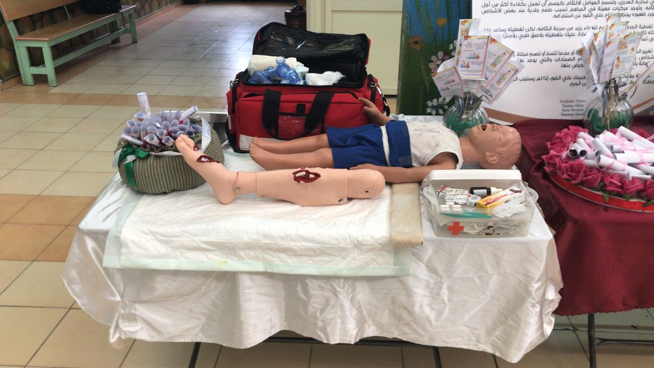 تم عقد ورشة عمل عن الاسعافات الأولية لطالبات المدرسة وحضرها ايضا بعض المدرسات تم فيها تناول التعريف بالإسعافات الاولية والهدف من سرعة اجراء الاسعافات الأولية ومكونات شنطة الاسعافات الأولية وضرورة وجودها في المنزل والمدرسة واماكن العمل.