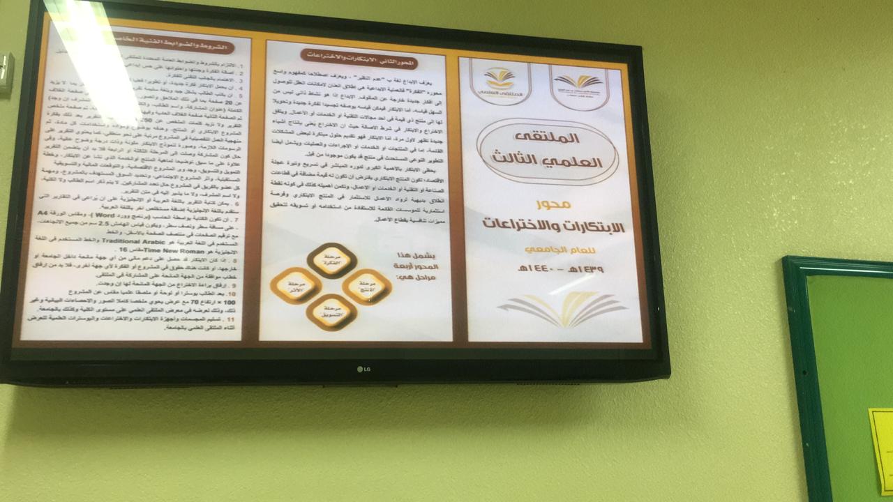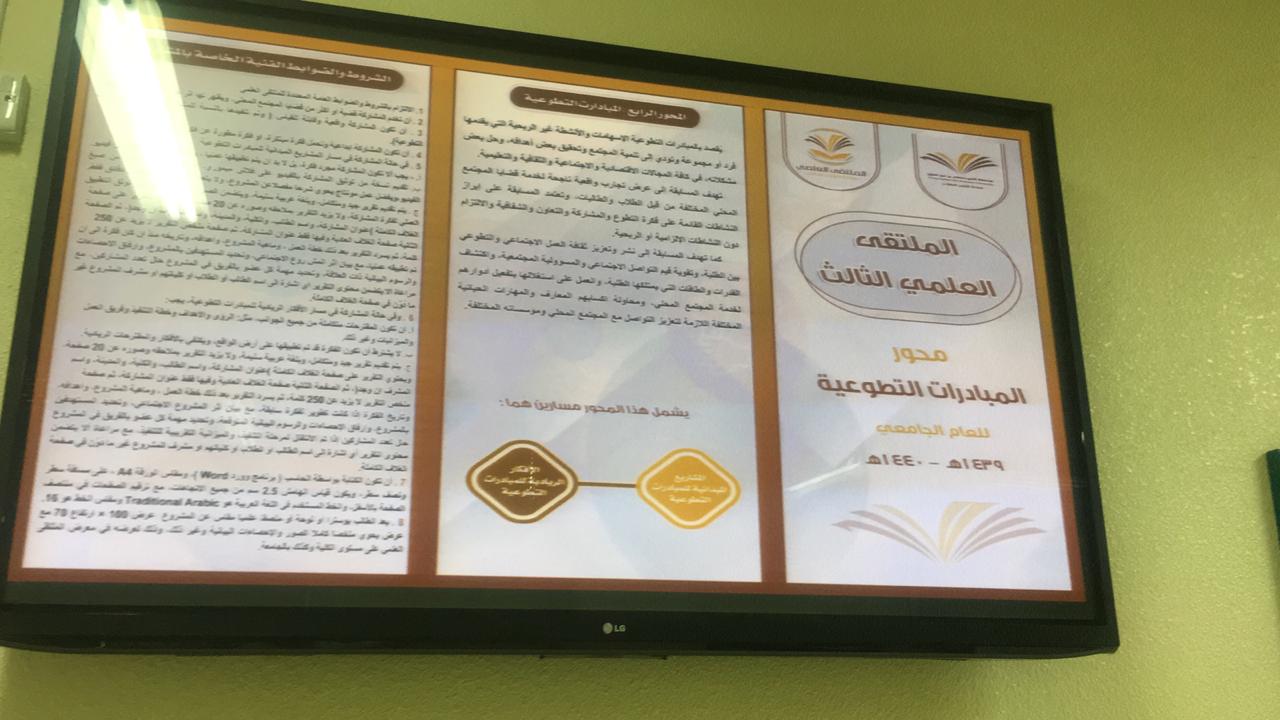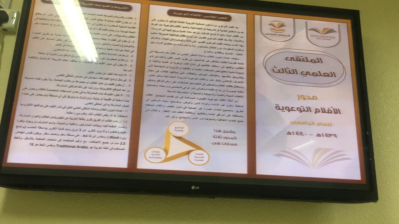 وايضاً متابعة اركان التعريف والتسجيل المنتشرة في مباني الكلية المختلفة بإشراف مباشر من طالبات المجلس وتوزيع نشرات المحاور على الطالبات وتحفيزهم للتسجيل وبحمد الله تم تسجيل عدد من الطالبات في المحاور وباذن الله ستستمر الحملة الدعائية في شاشات الكلية والبنرات وموقع الكلية وعلى أبواب القاعات وغيرها