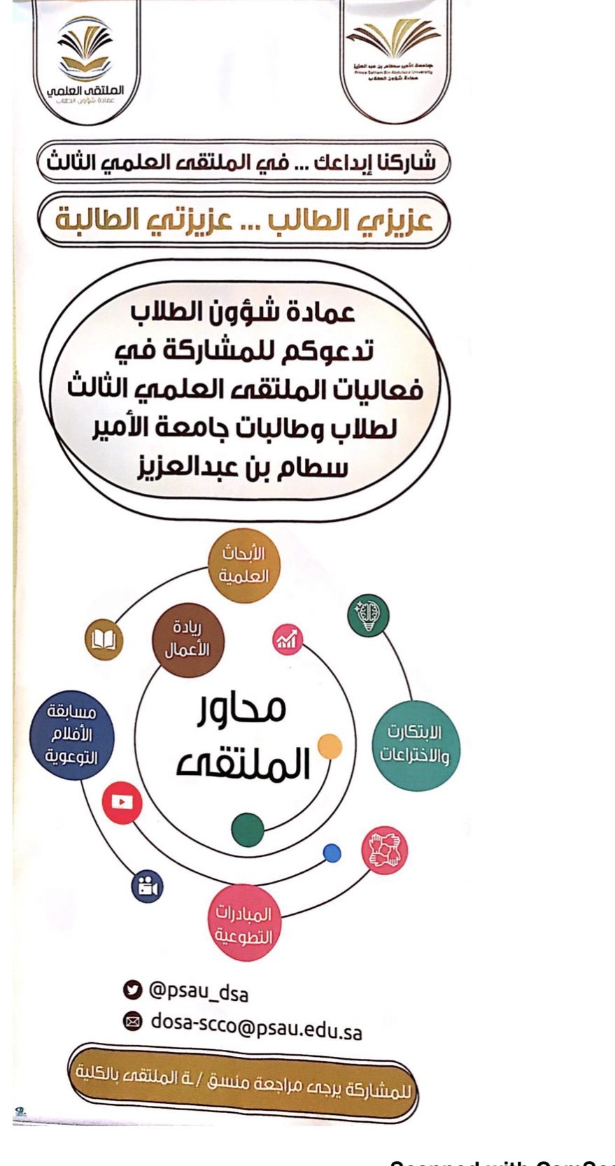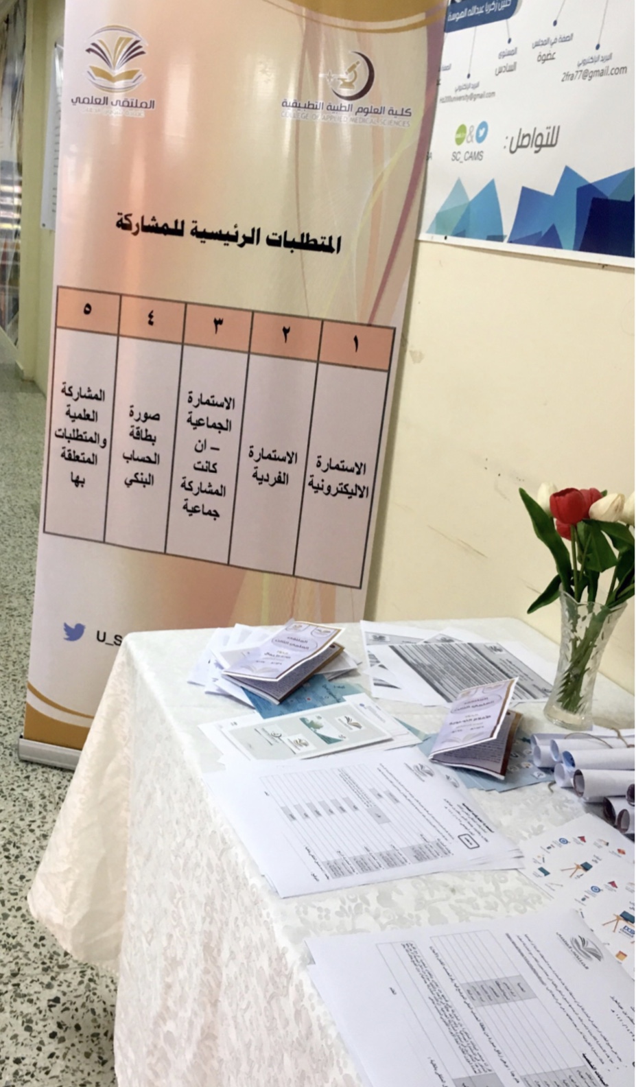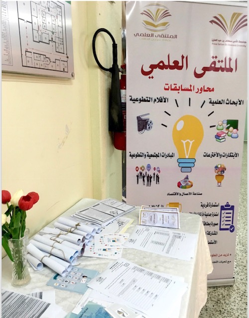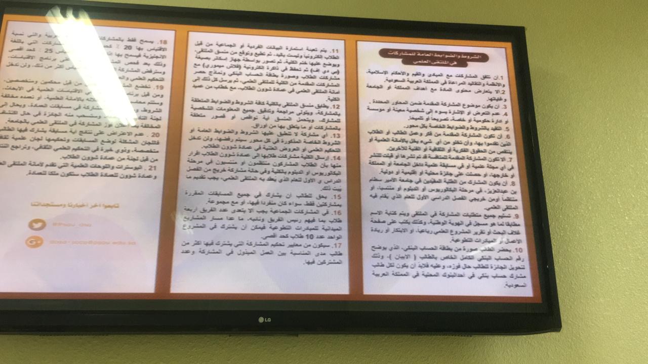 وايضاً متابعة اركان التعريف والتسجيل المنتشرة في مباني الكلية المختلفة بإشراف مباشر من طالبات المجلس وتوزيع نشرات المحاور على الطالبات وتحفيزهم للتسجيل وبحمد الله تم تسجيل عدد من الطالبات في المحاور وباذن الله ستستمر الحملة الدعائية في شاشات الكلية والبنرات وموقع الكلية وعلى أبواب القاعات وغيرها