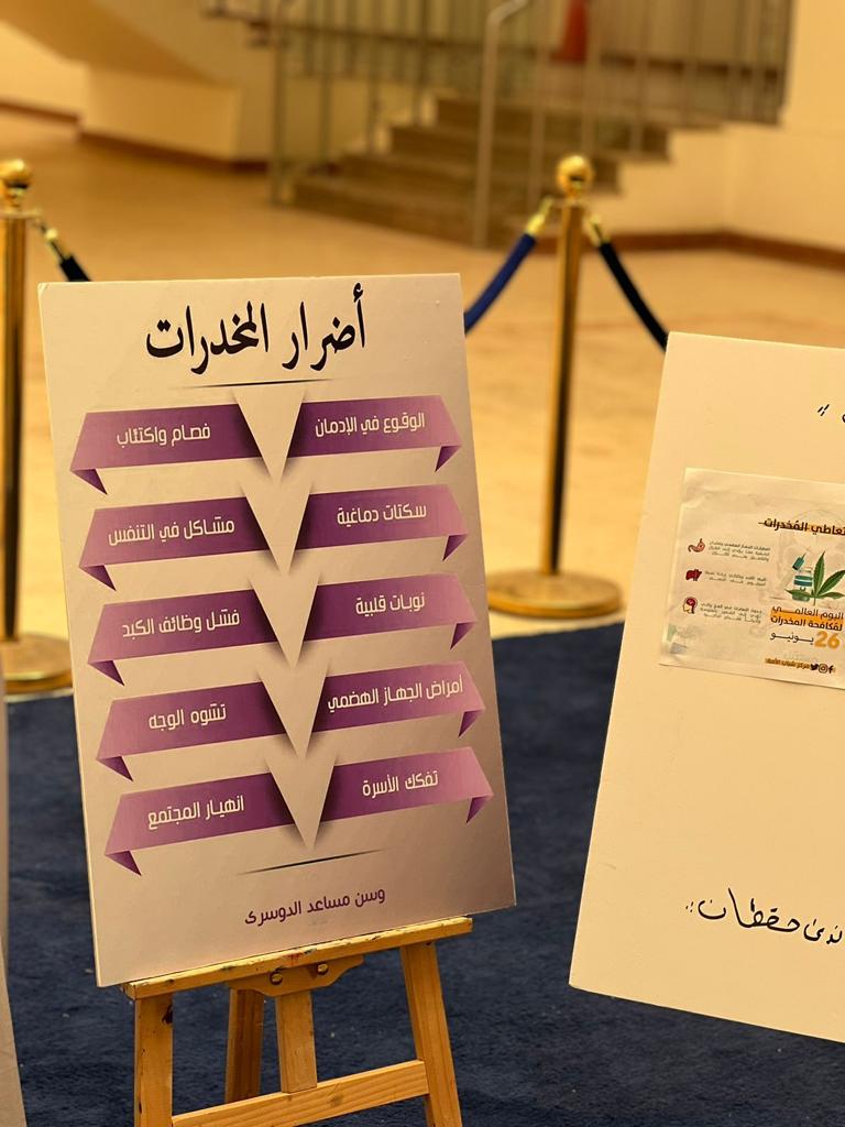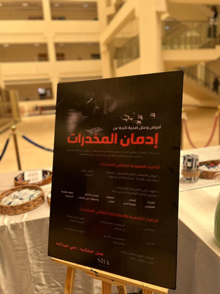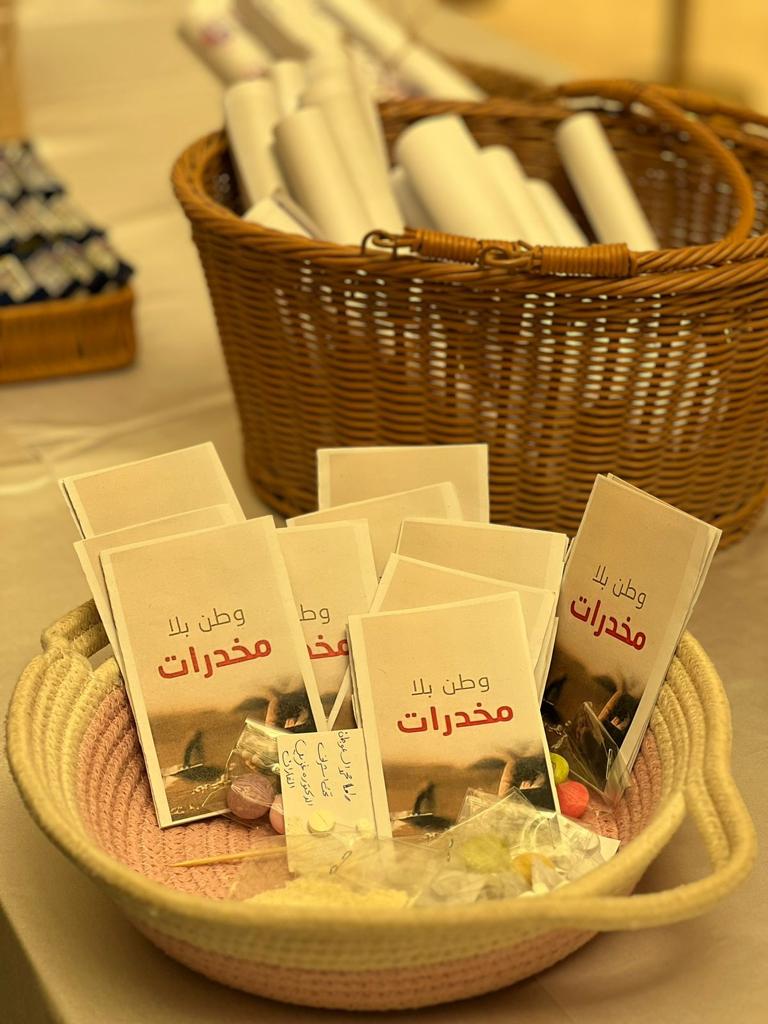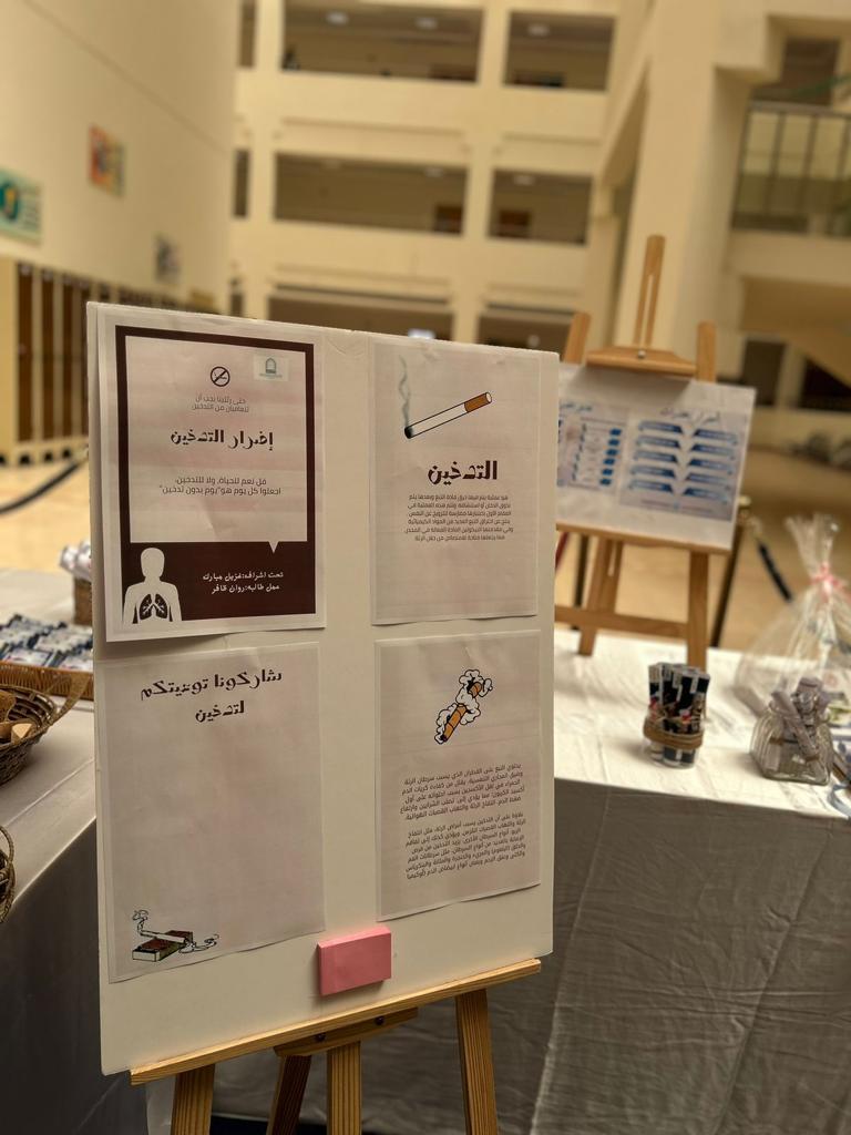 وتضمن المعرض على أركان للمشاركات فيه من الطالبات ، قدمت فيها العديد من الملصقات والمنشورات للتوعية بأضرار التدخين والمخدرات، واستعراض أهم أنواع المخدرات وأشكاله، وطرق الوقاية منها، وعلاج إدمانها.