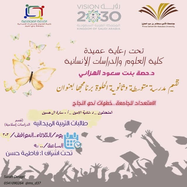 اقامت طالبات التدريب الميداني بكلية العلوم والدراسات الإنسانية بحوطة بني تميم بالتعاون مع وحدة القبول والتسجيل برنامج (اﻻستعداد للجامعة، خطوات نحو النجاح) بمدرسة متوسطة وثانوية الحلوة وذلك يوم الثلاثاء 3 / 3 / 1439 هـ. حيث تم استضافة الدكتورة نادية الأمين والأستاذة سارة التميمي اللاتي قدمن عرض تقديمي للحديث عن الجامعة وأهداف الكلية وأقسامها بالإضافة إلى تعريف الطالبات بشروط القبول وخطوات التقديم.