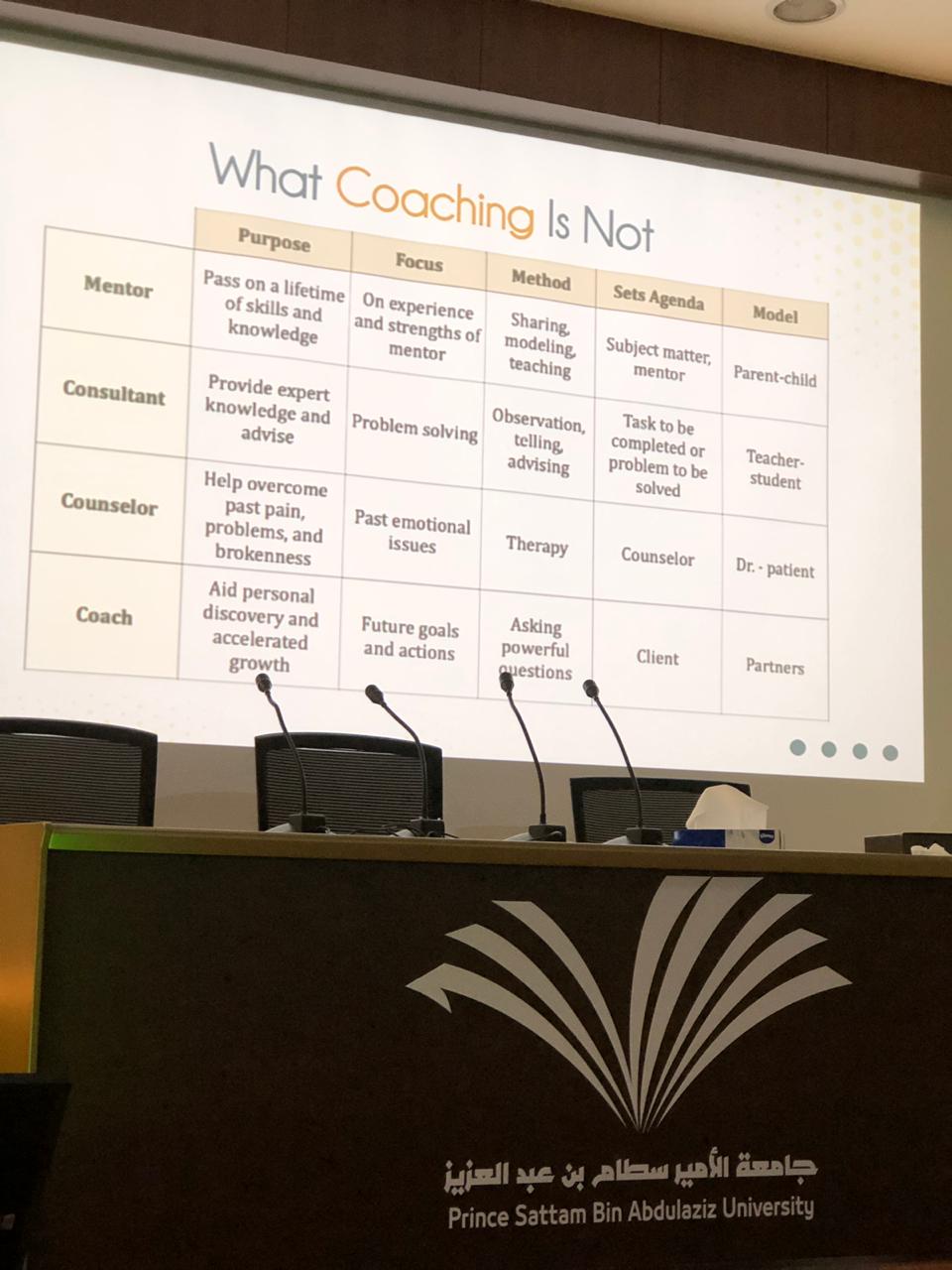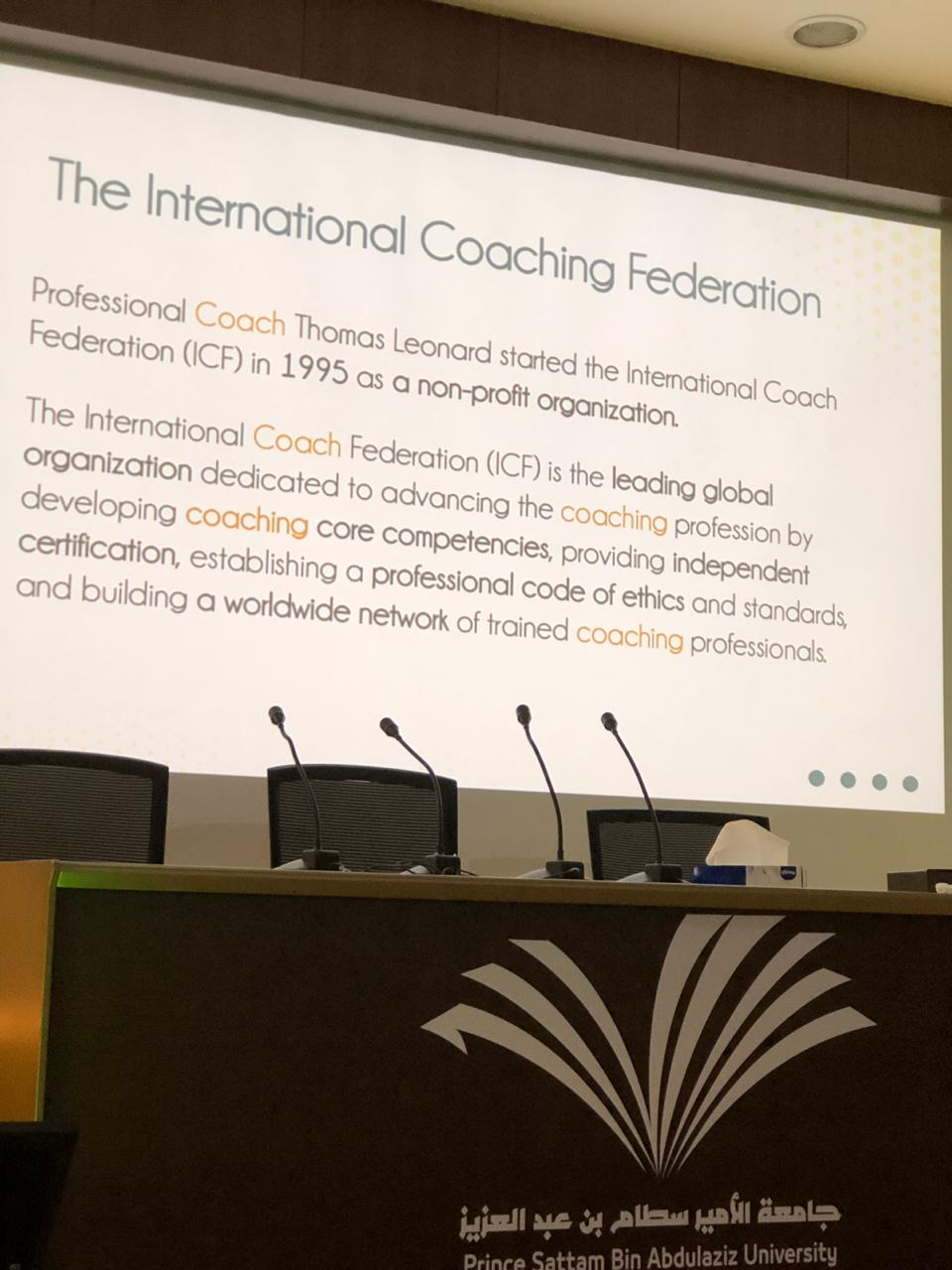 أقامت كلية العلوم والدراسات الإنسانية (قسم الطالبات) لقاءًا تعريفيًا بعنوان (The Power of Coaching) يوم الأربعاء الموافق 29/6/1440هـ من تنظيم الدكتورة فرح رضوان عضو هيئة تدريس بقسم الكيمياء حيث قدمته الاستاذة ريم الجيزاوي رئيسة الاتحاد العالمي للكوتشينج فرع المملكة العربية السعودية والرئيس والمدير التنفيذي لشركة COREACH.