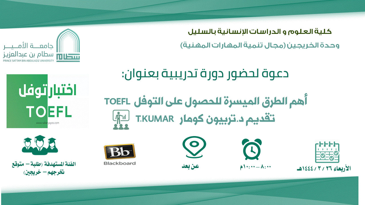 نظمت وحدة الخريجين (مجال تنمية المهارات المهنية) بكلية العلوم والدراسات الإنسانية بالسليل دورة تدريبية عن بعد تحت عنوان:(أهم الطرق الميسرة في الحصول على التوفل )، قدمها الأستاذ المساعد بقسم اللغة الإنجليزية الدكتور تربيون كومار، وذلك يوم الأربعاء بتاريخ 24/ 3 / 1445هـ.