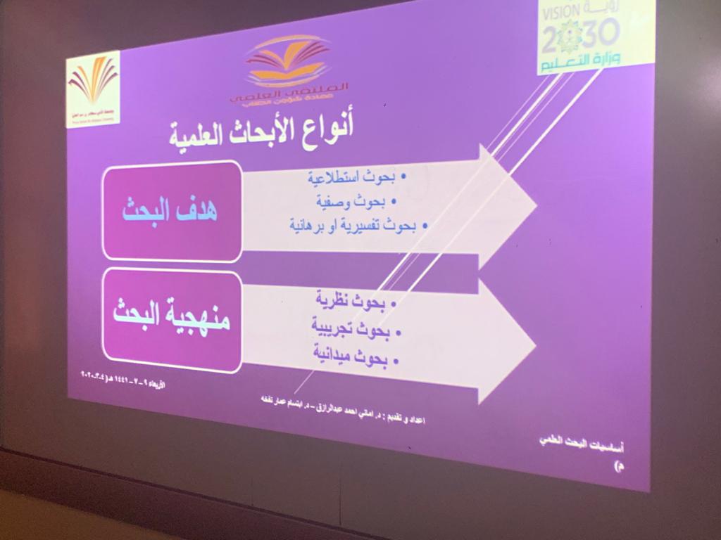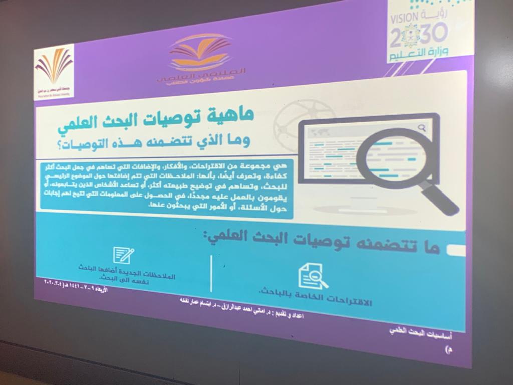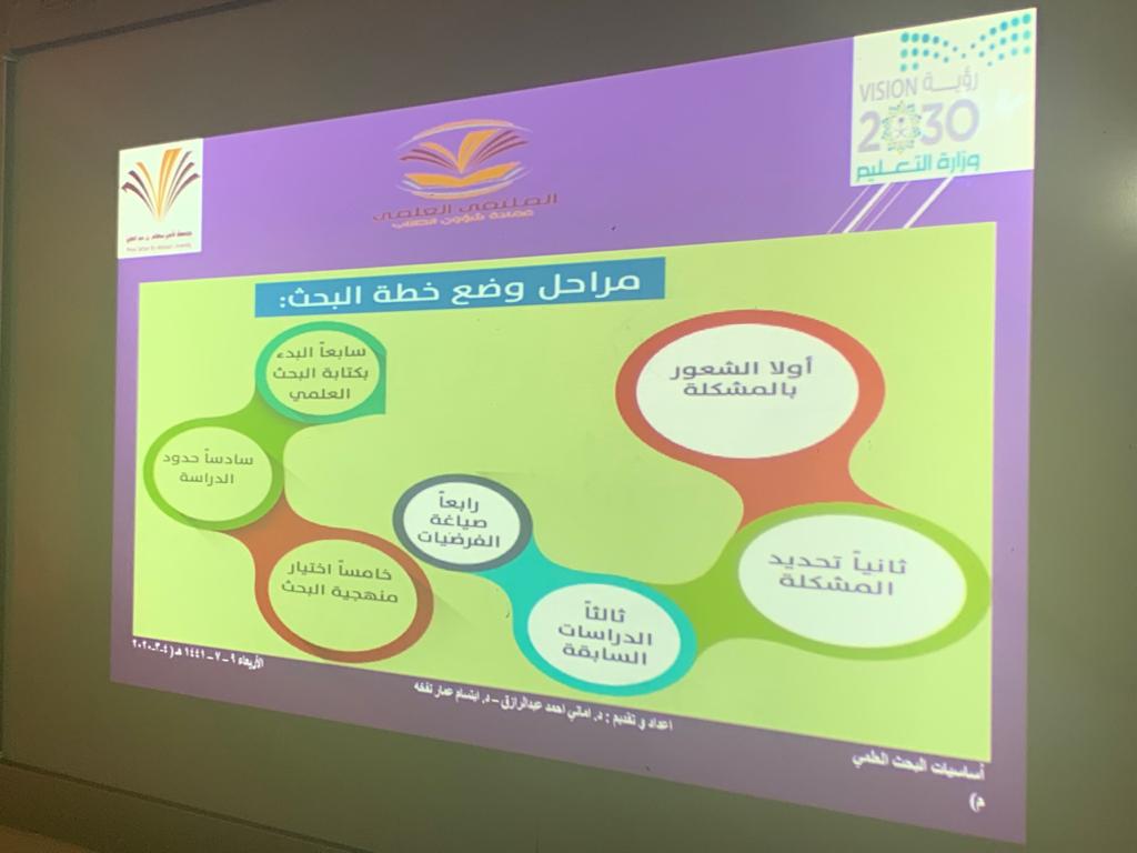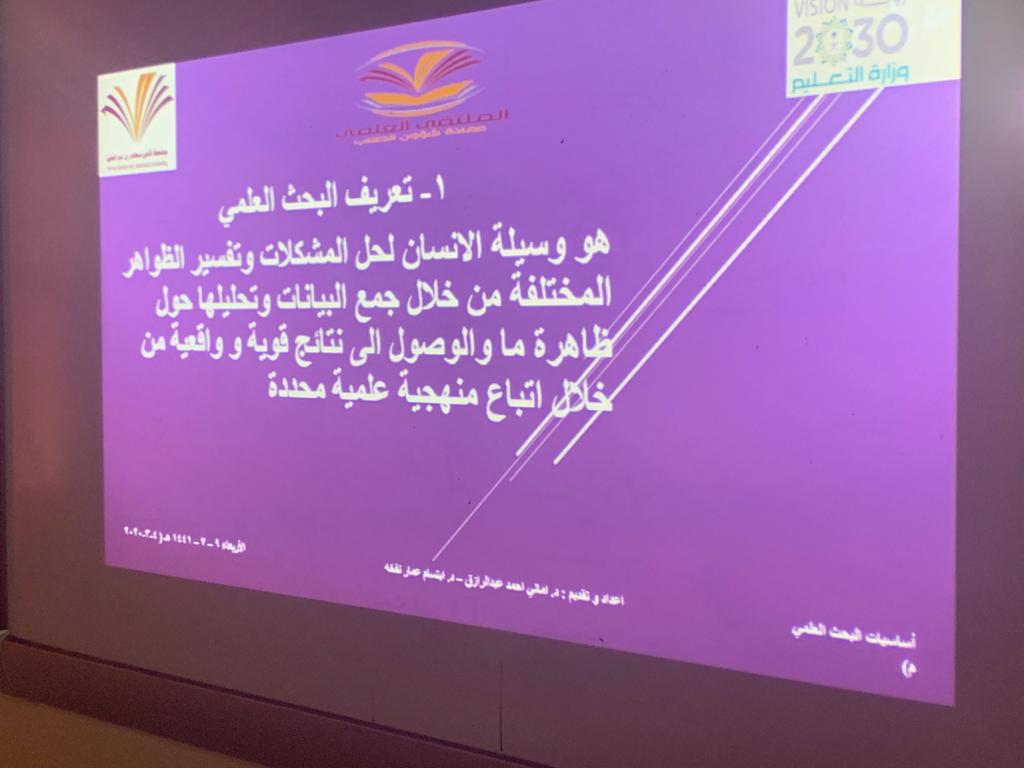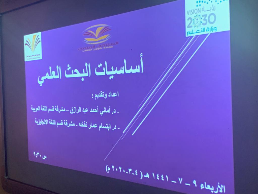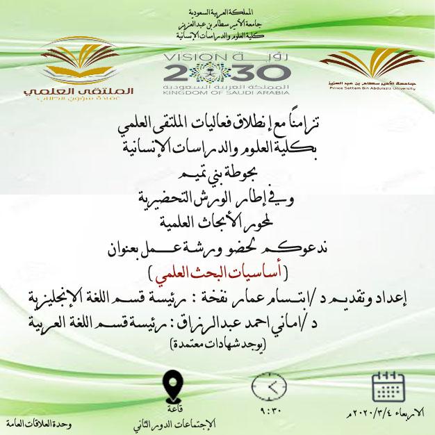 تزامناً مع انطلاق فعاليات الملتقى العلمي الطلابي و في إطار الورش التحضيرية لمحور الابحاث العلمية، بكلية العلوم والدراسات الإنسانية بحوطة بني تميم.، تحت قيادة سعادة عميدة الكلية د. حصة بنت سعود الهزاني. قدمت د. أماني أحمد عبدالرازق مشرفة قسم اللغة العربية و د. ابتسام عمار نفخه مشرفة قسم اللغة الإنجليزية. ورشة بعنوان "أساسيات البحث العلمي" وذلك في يوم الأربعاء الموافق: 1441/7/9هـ، في تمام الساعة 9:30 صباحاً. حيث تم التعريف بمفهوم البحث العلمي و عرض صفات الباحث العلمي. ثم تم عرض مراحل البحث العلمي و كيفية كتابته. حضرت الورشة عدد من الطالبات و مجموعة من عضوات هيئة التدريس. تمت مناقشة مختلف مكونات البحث العلمي مع الطالبات الحاضرات لترسيخ المفاهيم لديهن. و في ختام الورشة تم توزيع استمارات المشاركة على الطالبات و تشجيعهن على المشاركة بأبحاث علمية في الملتقى الطلابي.