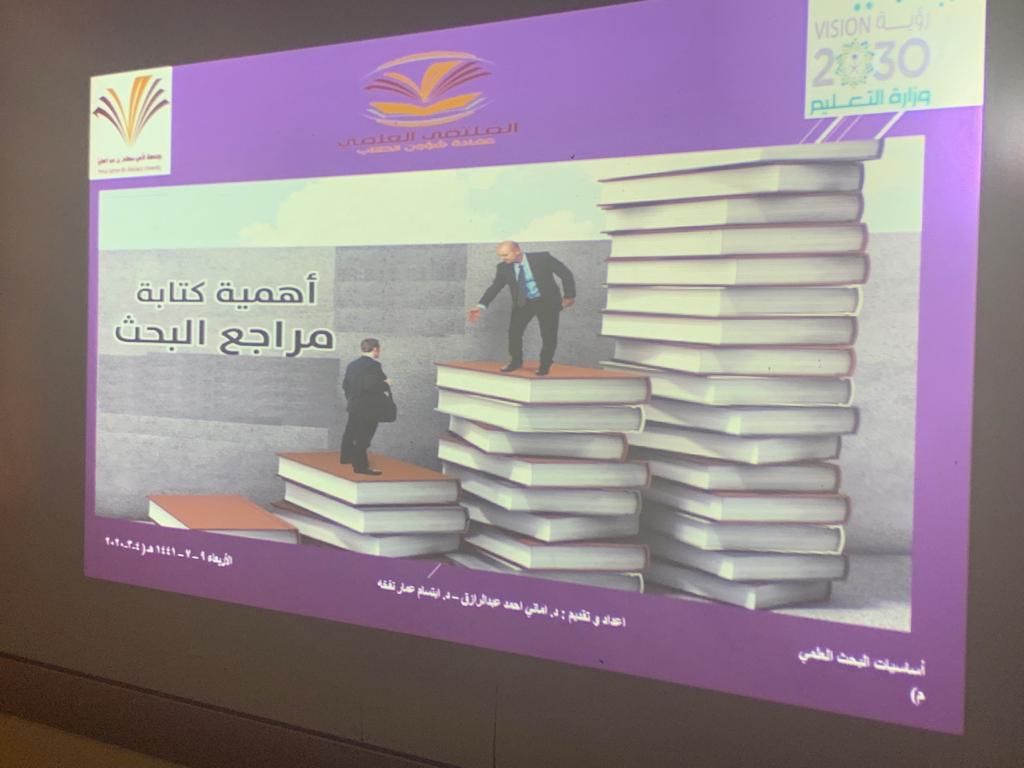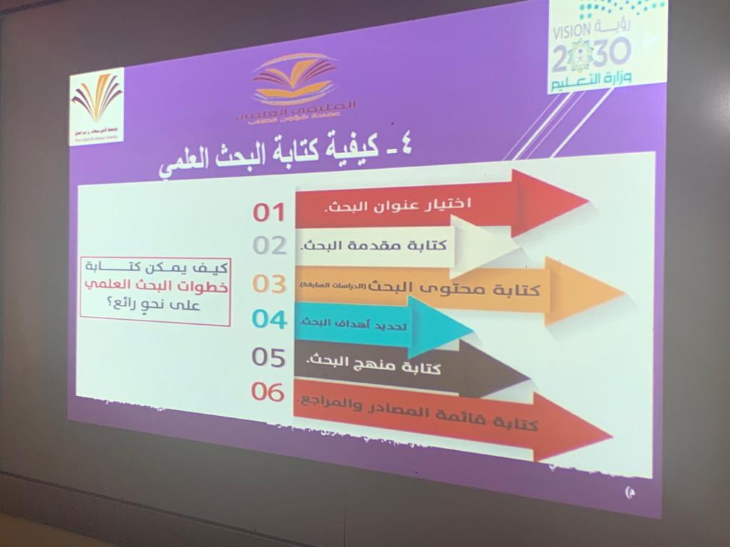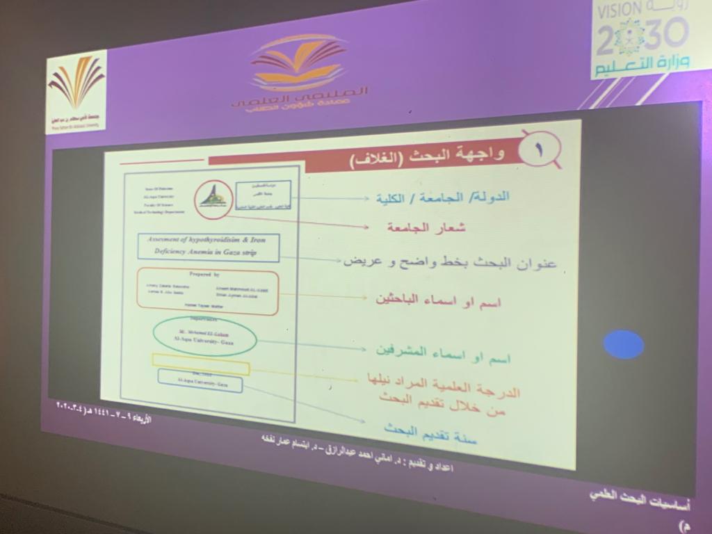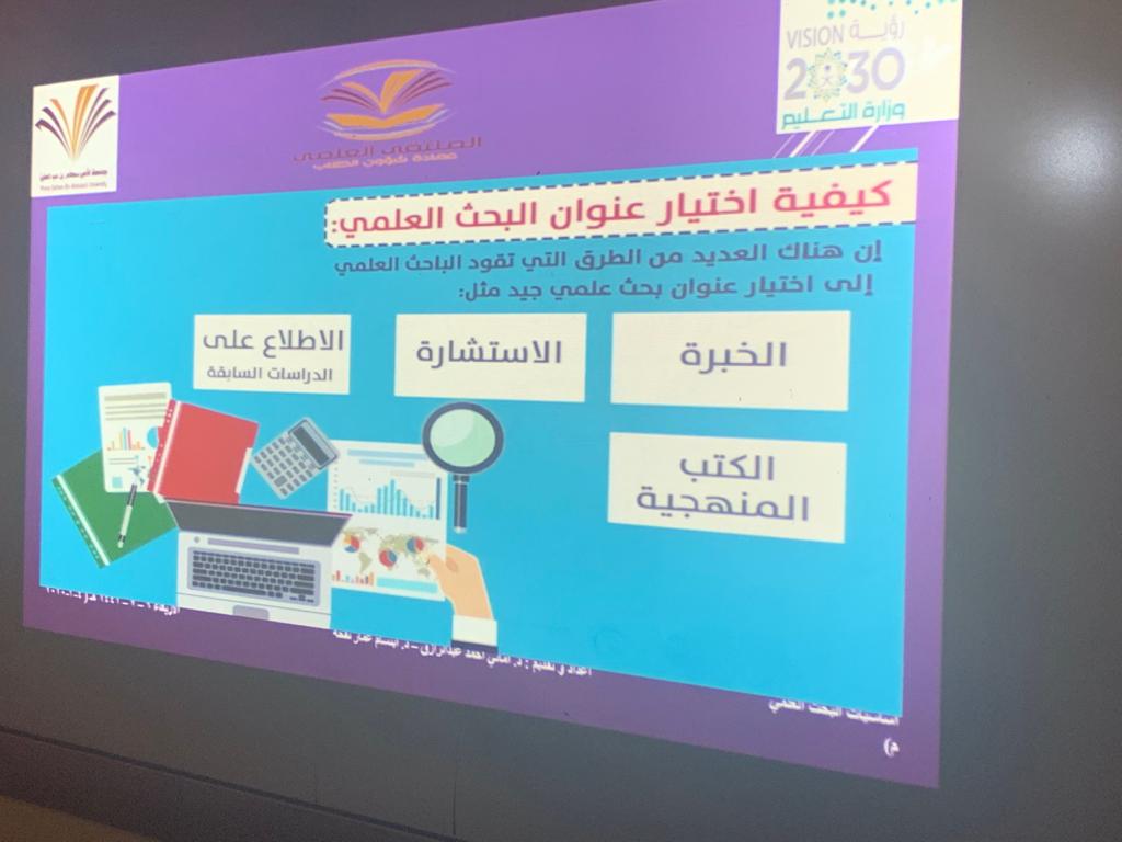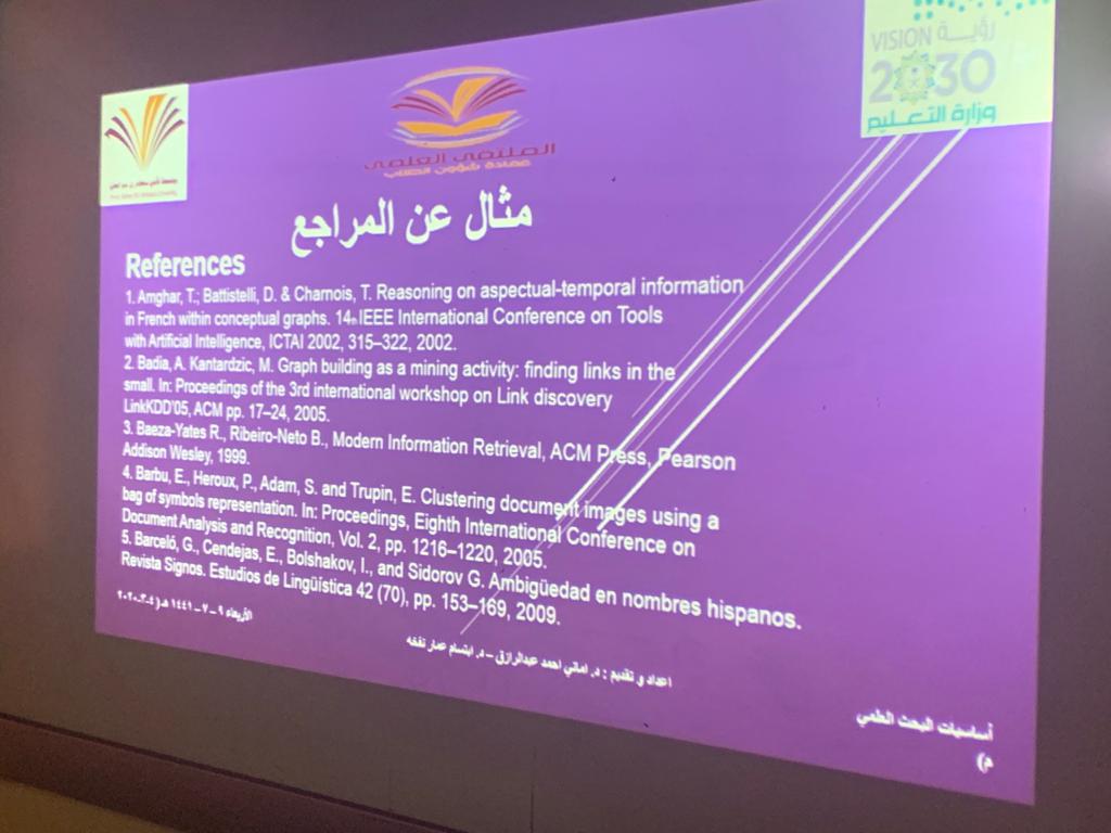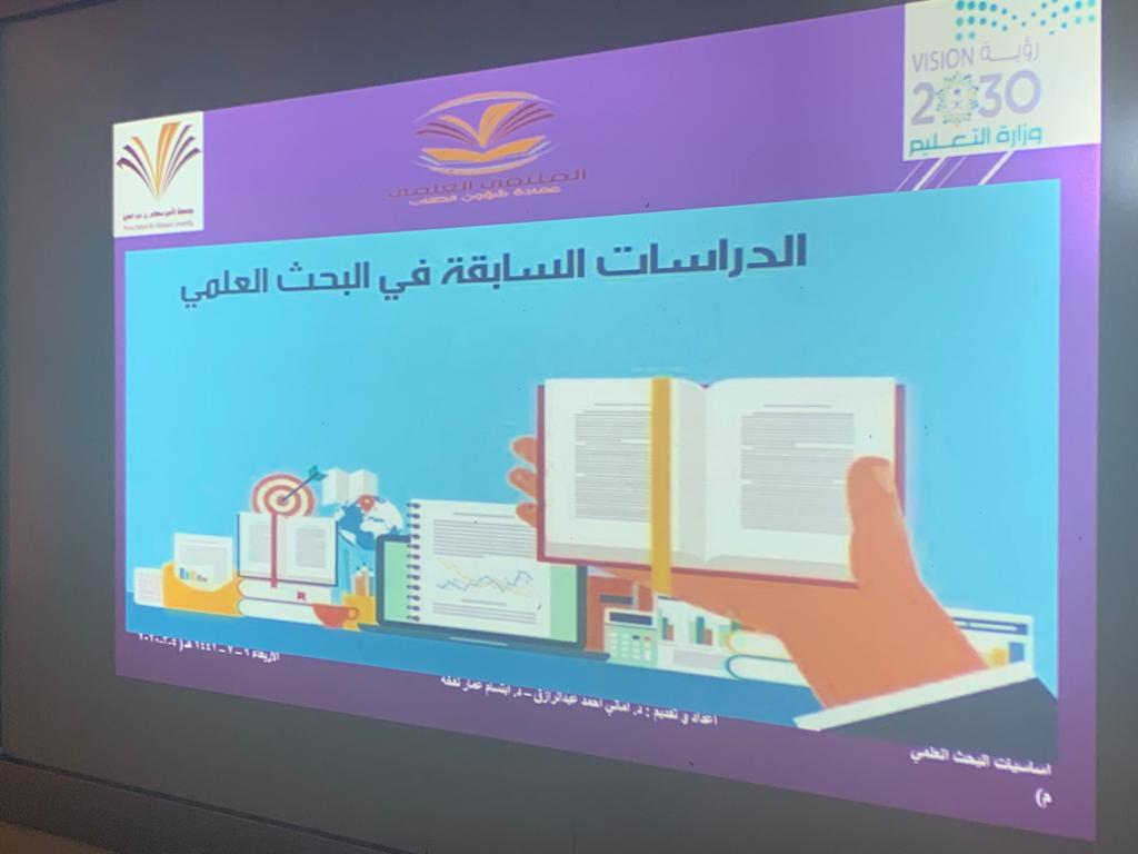 تزامناً مع انطلاق فعاليات الملتقى العلمي الطلابي و في إطار الورش التحضيرية لمحور الابحاث العلمية، بكلية العلوم والدراسات الإنسانية بحوطة بني تميم.، تحت قيادة سعادة عميدة الكلية د. حصة بنت سعود الهزاني. قدمت د. أماني أحمد عبدالرازق مشرفة قسم اللغة العربية و د. ابتسام عمار نفخه مشرفة قسم اللغة الإنجليزية. ورشة بعنوان "أساسيات البحث العلمي" وذلك في يوم الأربعاء الموافق: 1441/7/9هـ، في تمام الساعة 9:30 صباحاً. حيث تم التعريف بمفهوم البحث العلمي و عرض صفات الباحث العلمي. ثم تم عرض مراحل البحث العلمي و كيفية كتابته. حضرت الورشة عدد من الطالبات و مجموعة من عضوات هيئة التدريس. تمت مناقشة مختلف مكونات البحث العلمي مع الطالبات الحاضرات لترسيخ المفاهيم لديهن. و في ختام الورشة تم توزيع استمارات المشاركة على الطالبات و تشجيعهن على المشاركة بأبحاث علمية في الملتقى الطلابي.